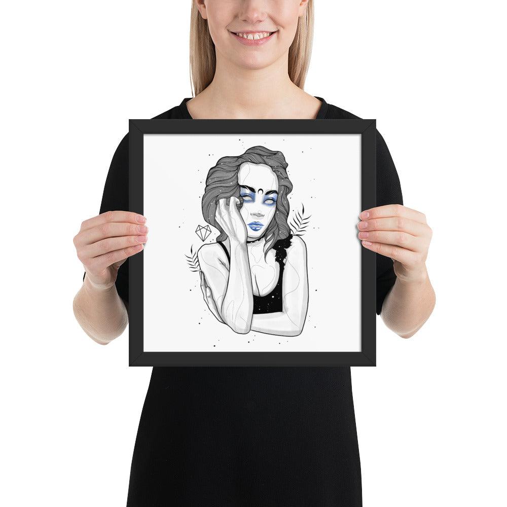 Framed poster printed on high-quality paper, with a partly glossy, partly matte finish.
