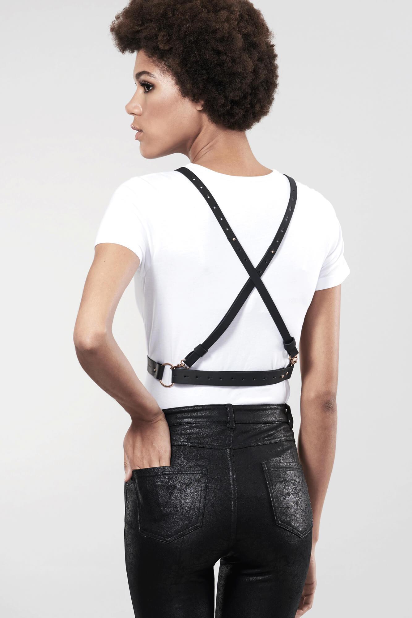 The straps of this harness adorn the chest. Goes with the best outfits, lingerie or simply bare skin. The straps of this accessory can cross at the back. Measures at the waist 37" maximum and 23.62" minimum. Includes two extender straps.