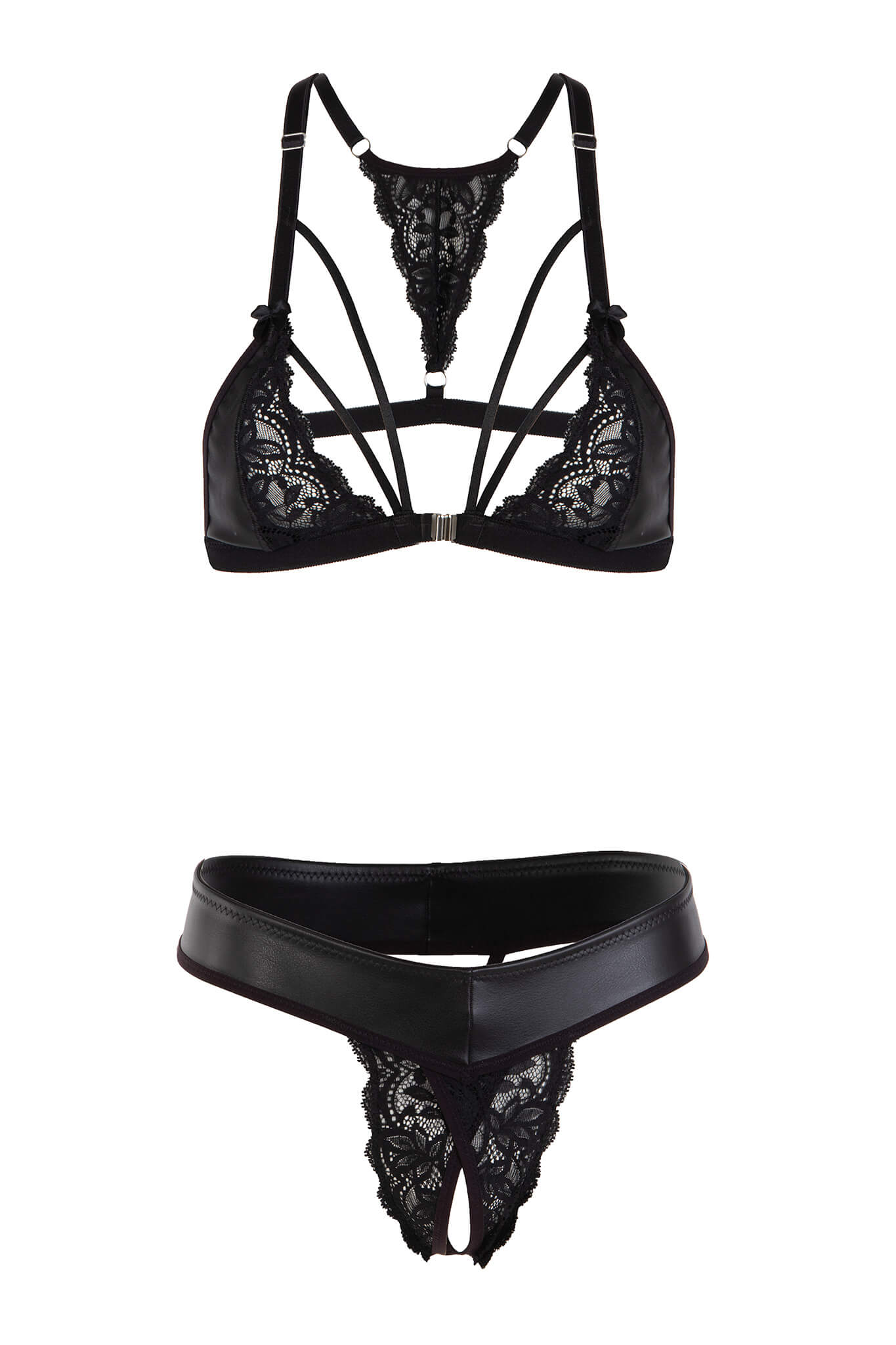 Let your inner goddess shine through and make him swoon with the Eros Vegan Leather Lace Set! This lingerie set is sure to give you a sexy boost with its triangle black vegan leather-look bra and thong for a look that's both feminine and fierce. With its discreet front lace inserts that fit perfectly to the shape of your body, adjustable shoulder straps topped with elegant black bows, and a center clip closure, this delicate lace set will keep it secure yet comfortable.