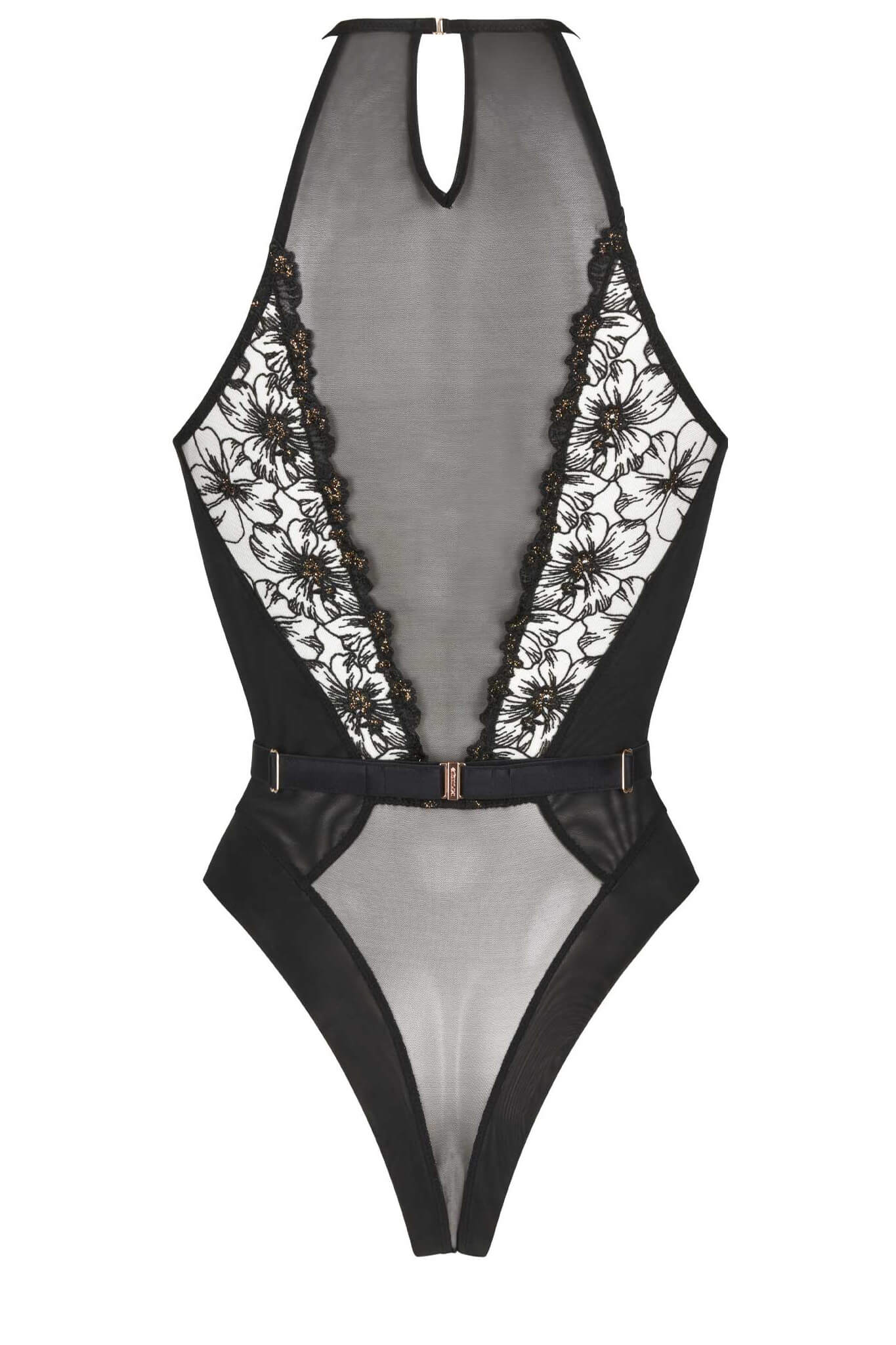 In mesh lined on the sides and tulle embroidered with black and pink gold threads on the chest, private part and back. Easy opening at the crotch, jewel and belt removable.