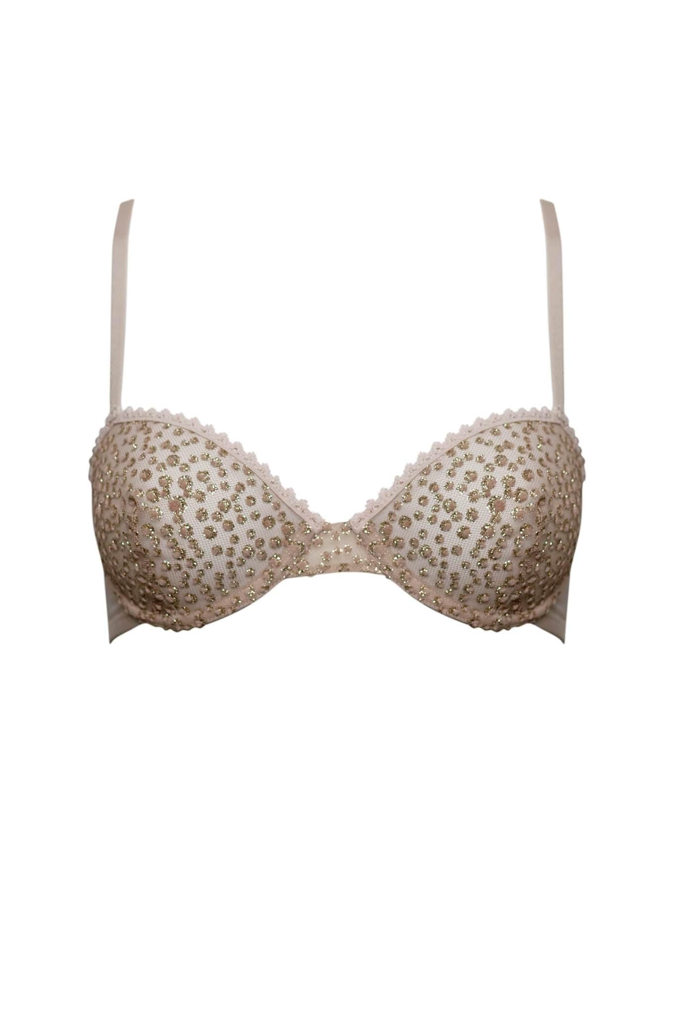 Metallic frocked tulle and Italian stretch net Demi cup with grosgrain fold-over elastics and fully adjustable straps.