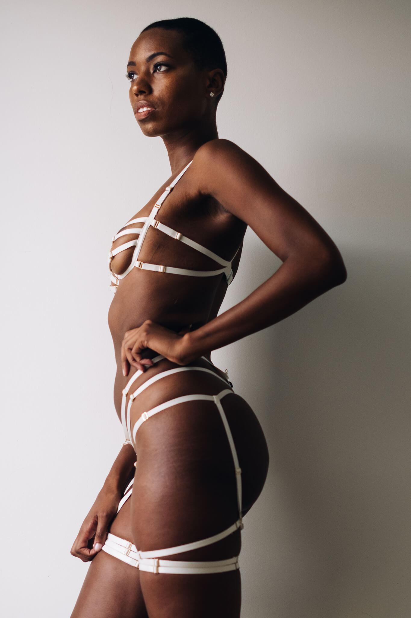The sexy Barbara bondage lingerie set is matched here with the sexy Mimi Bondage Garter, so it’s just you and the straps. The panel-less strappy design will instantly put you in charge as it hits and clings to the thighs or your neck. This garter oozes pure seduction and puts all the cards in your hands. Ready to take all control?