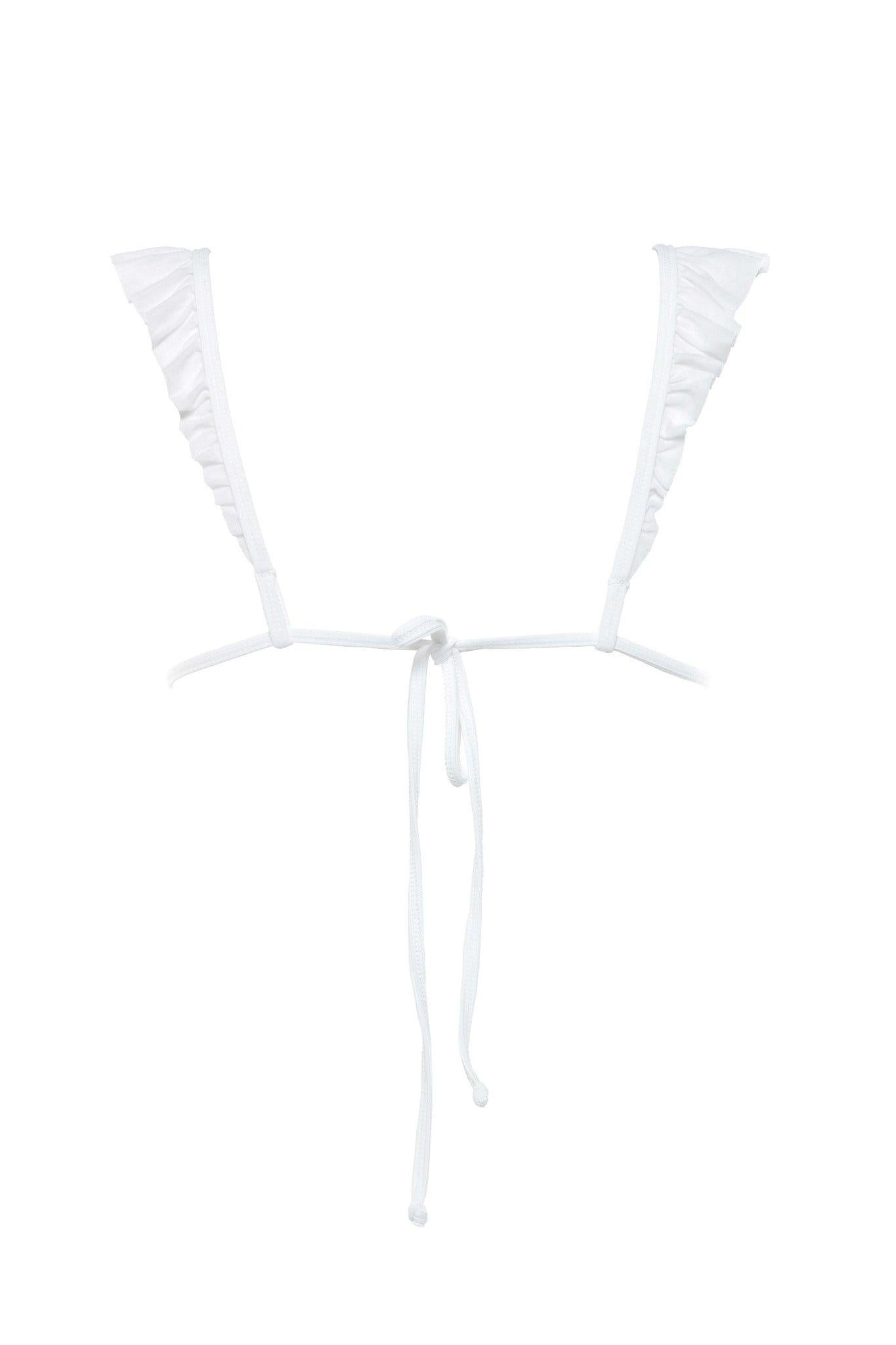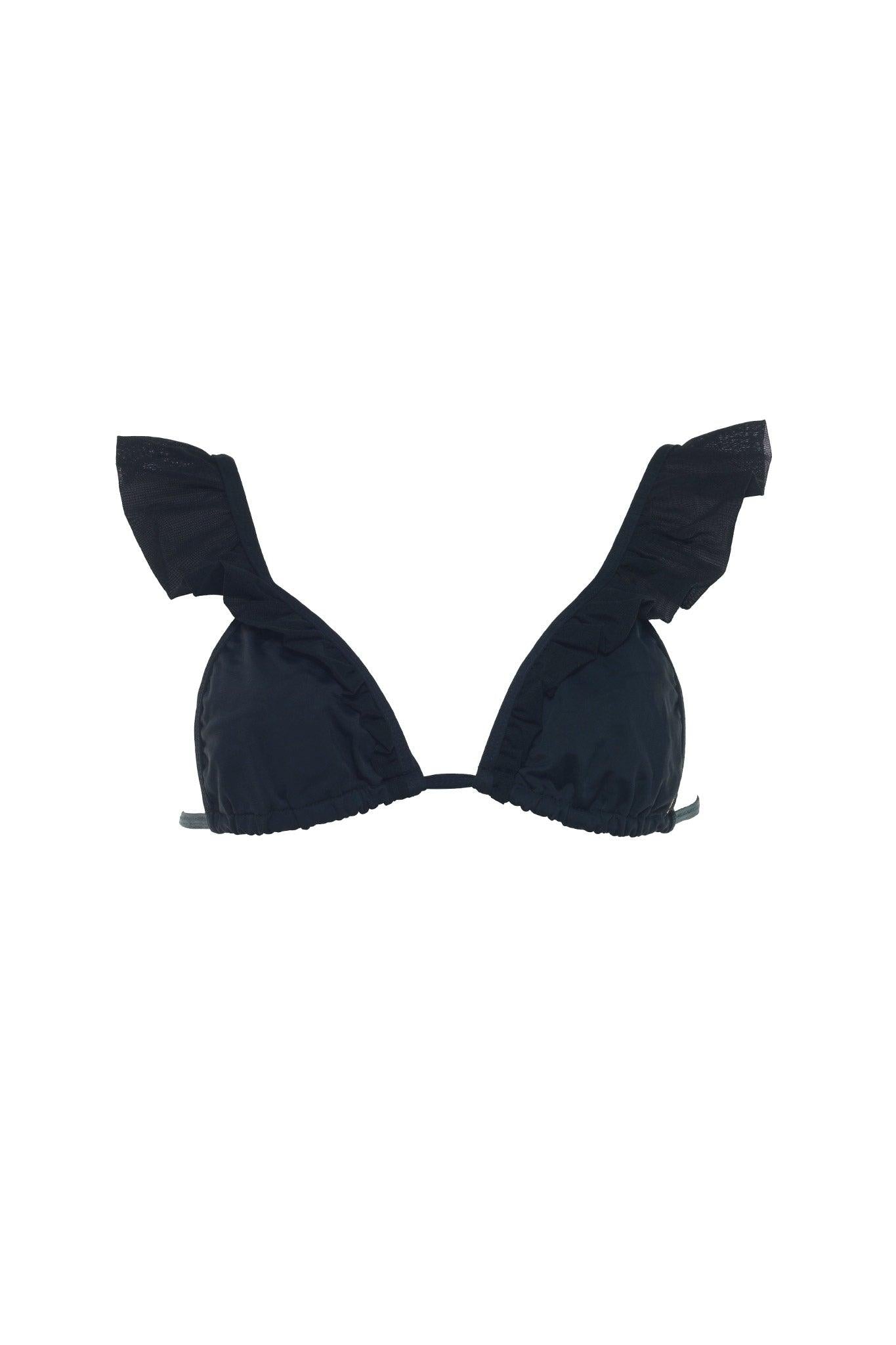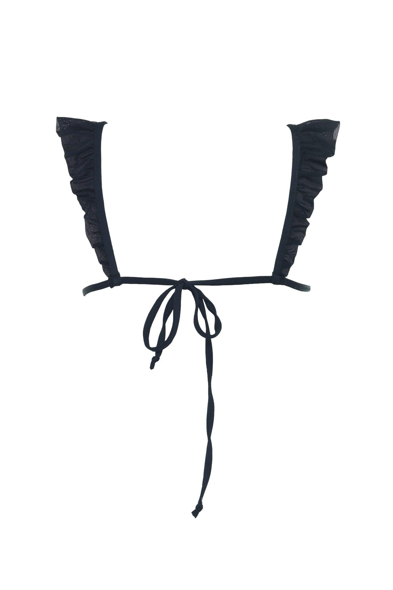 Flirty Feminine top with luxury mesh fabric ruffle accents. Adjustable slide back tie. The Rumi is designed with all the special events in mind from daytime at the beach or poolside at the resort, to night time dining and dancing.