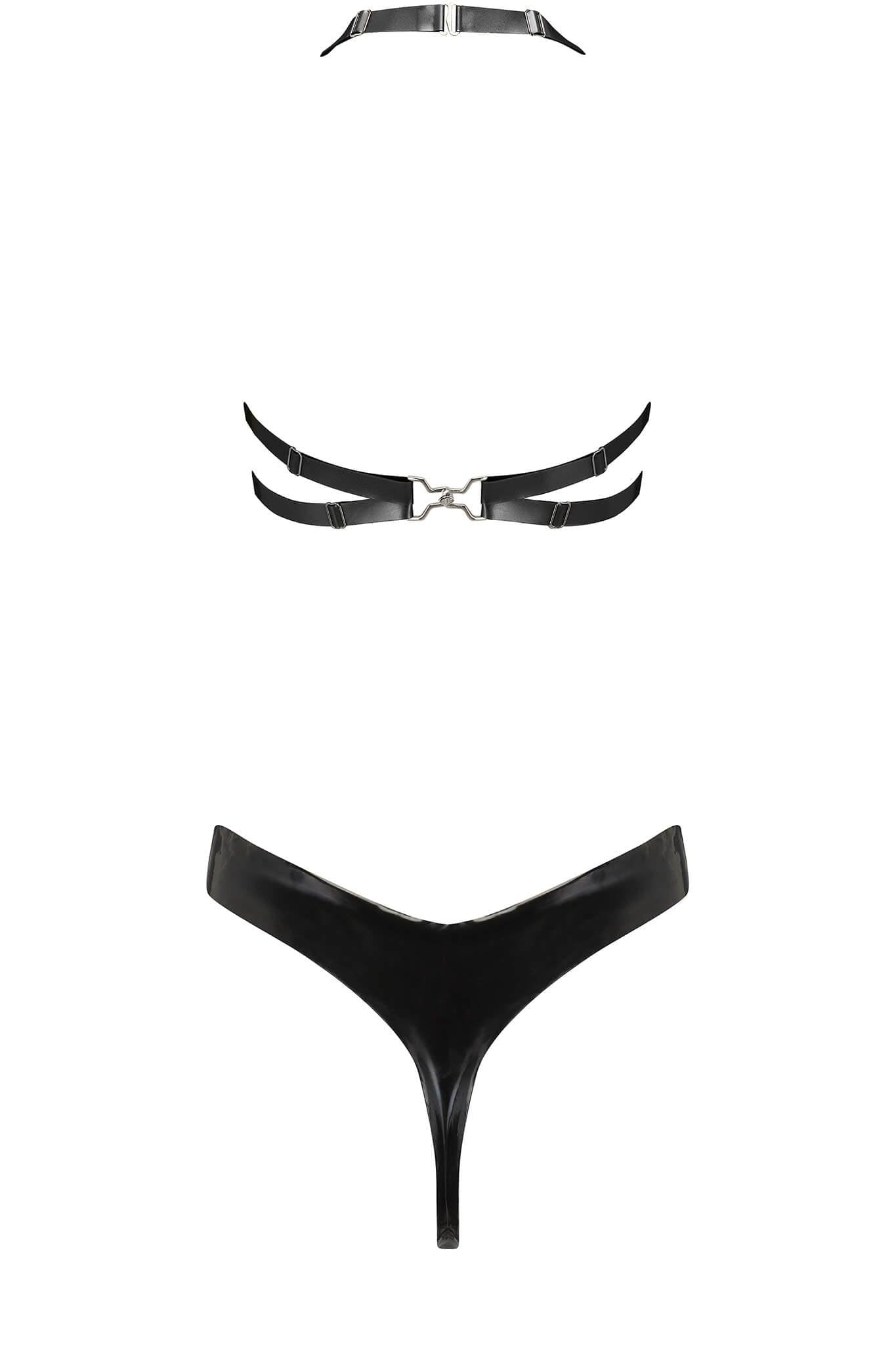 The Gamma Bra is the first latex cradle-less plunge bra with a waterfall gem appliqué to the centre front, and is paired with the matching Tau Thong.