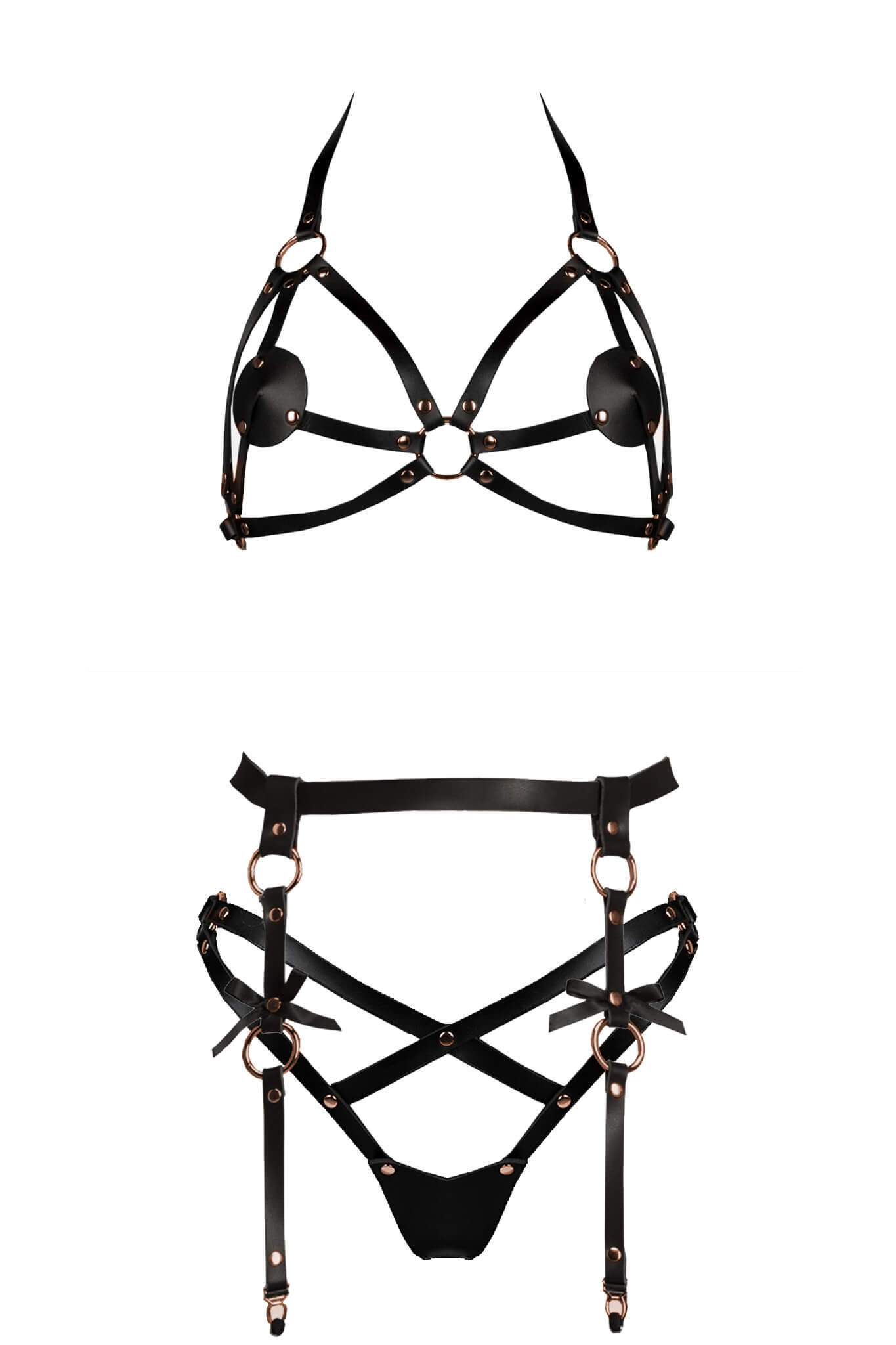 The Supreme Leather Harness Set from the Luxe Bondage collection is handmade comfortable Portuguese leather. The design beautifully frames your bust and covers your nipples.