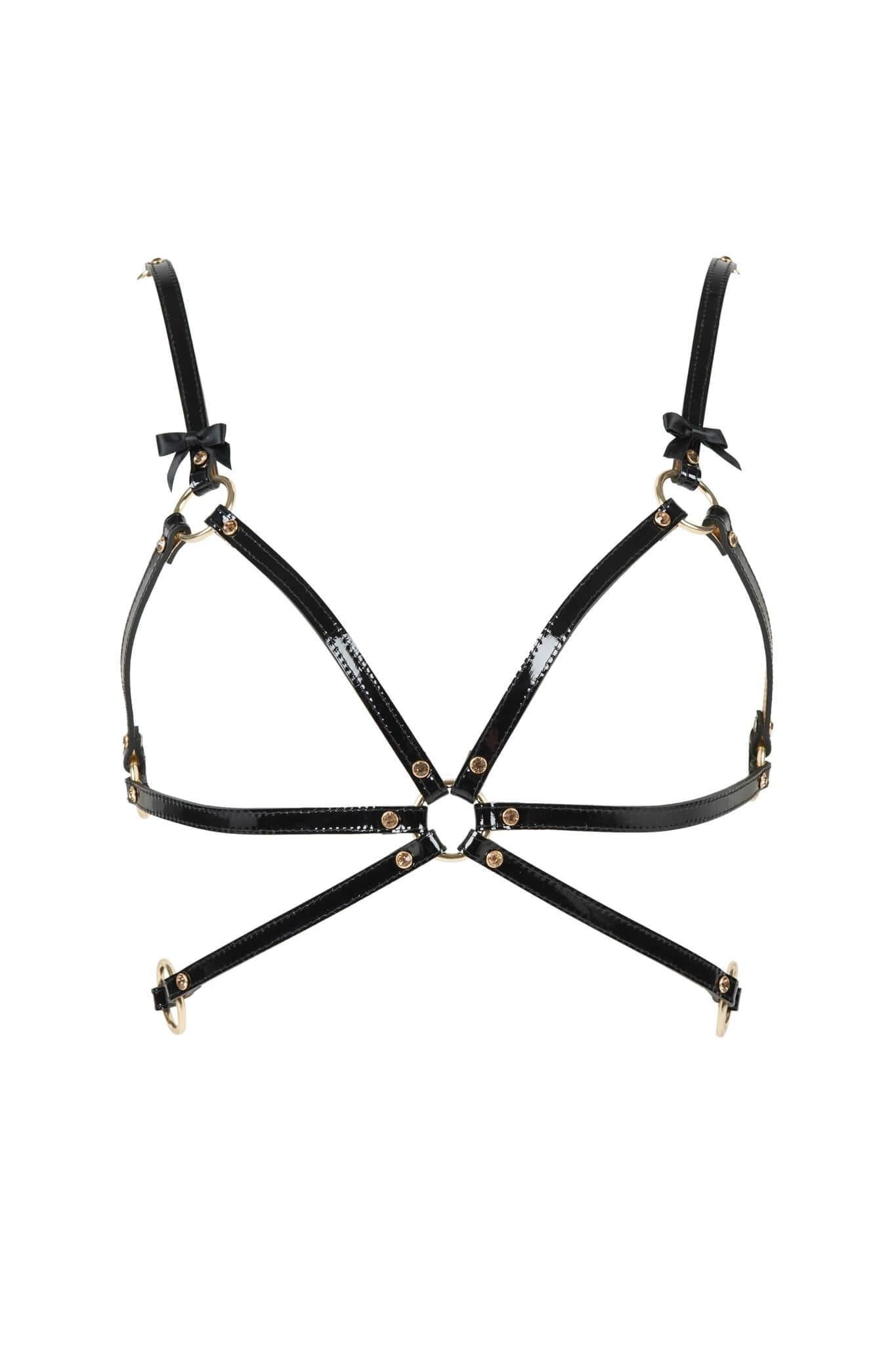 Unleash your inner Sex Kitten wearing our Jet Playsuit! Featuring detachable black & leather garters, gold crystal rivets, and hand sewn black satin bow details. Style this flirty playsuit with or without garters over your favorite fashion outfit.