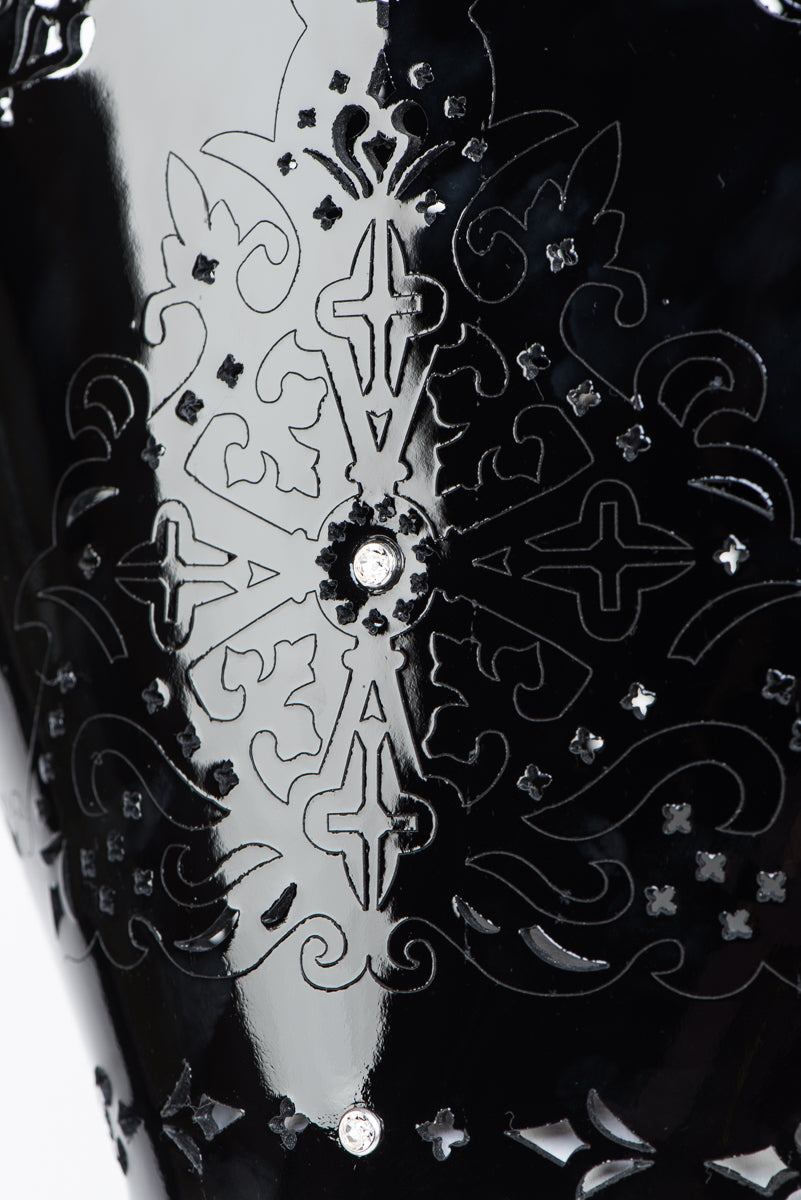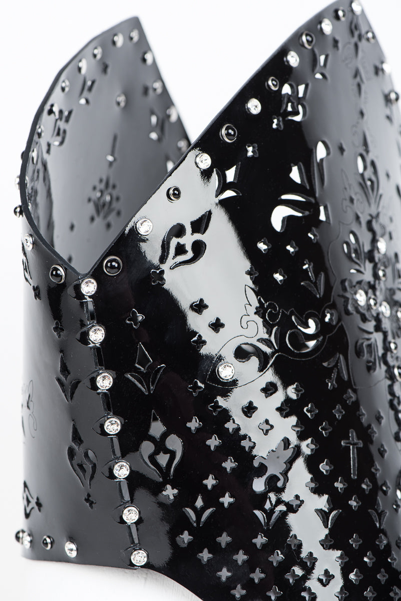 Dive into luxury with the striking Original Sin collection, where high fashion and sensuality collide. Inspired by opulent Catholic imagery, each piece showcases custom laser-cut black patent leather panels and intricate cross appliqués, creating bold yet elegant designs. SWAROVSKI® crystals and sophisticated black pearl silver-rimmed rivets add just the right amount of sparkle, making every item a true masterpiece.