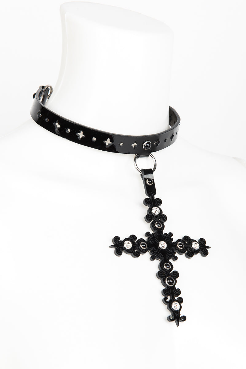 - Black Shiny Patent Leather Laser Cut Cross & Choker
