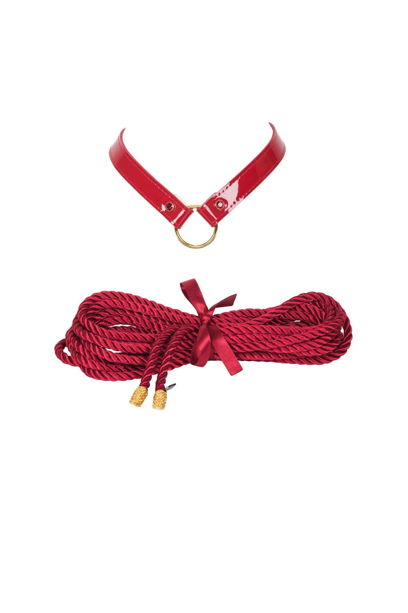 Bound yourself in glamour with our Red Hot Bondage Set! Featuring our Leather Collar and 5 meters of Luxury Bondage Rope. This set is ultra versatile and can be used in many ways!