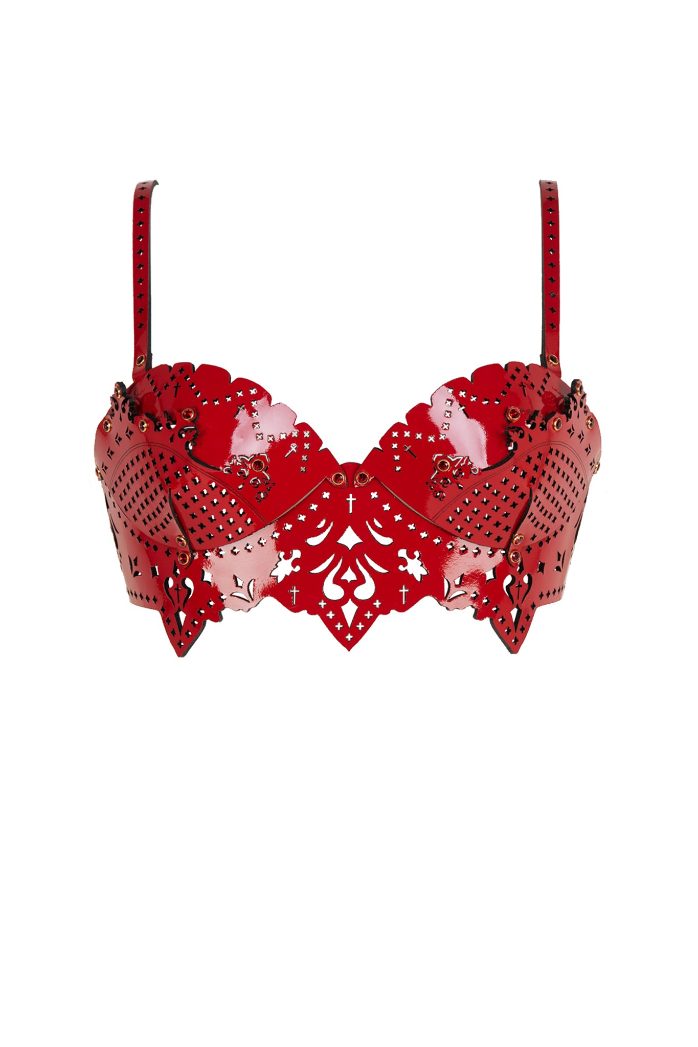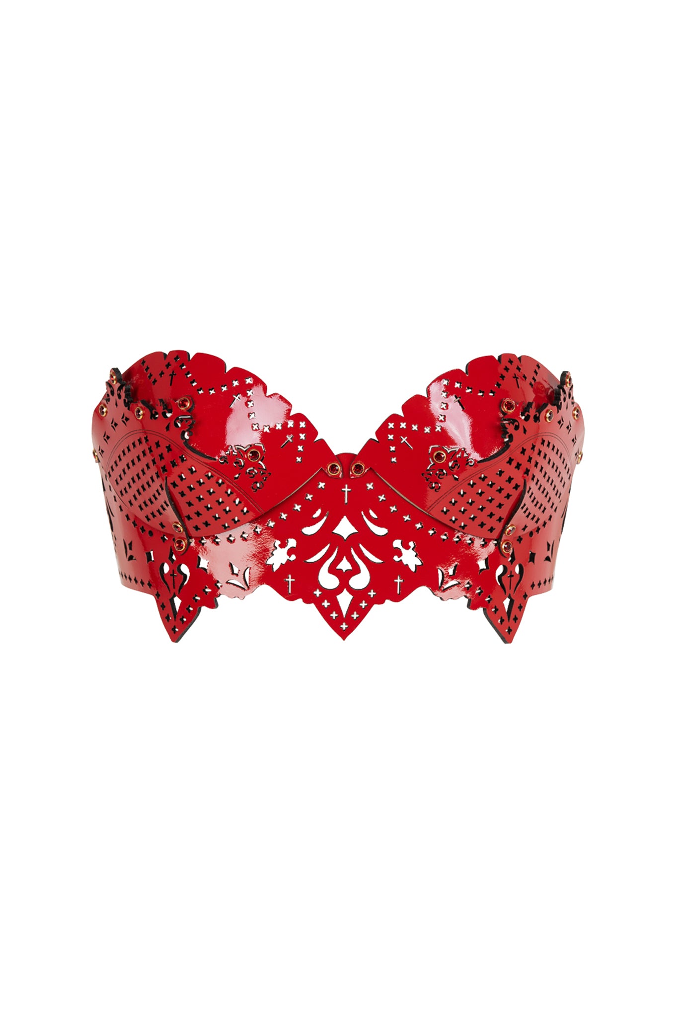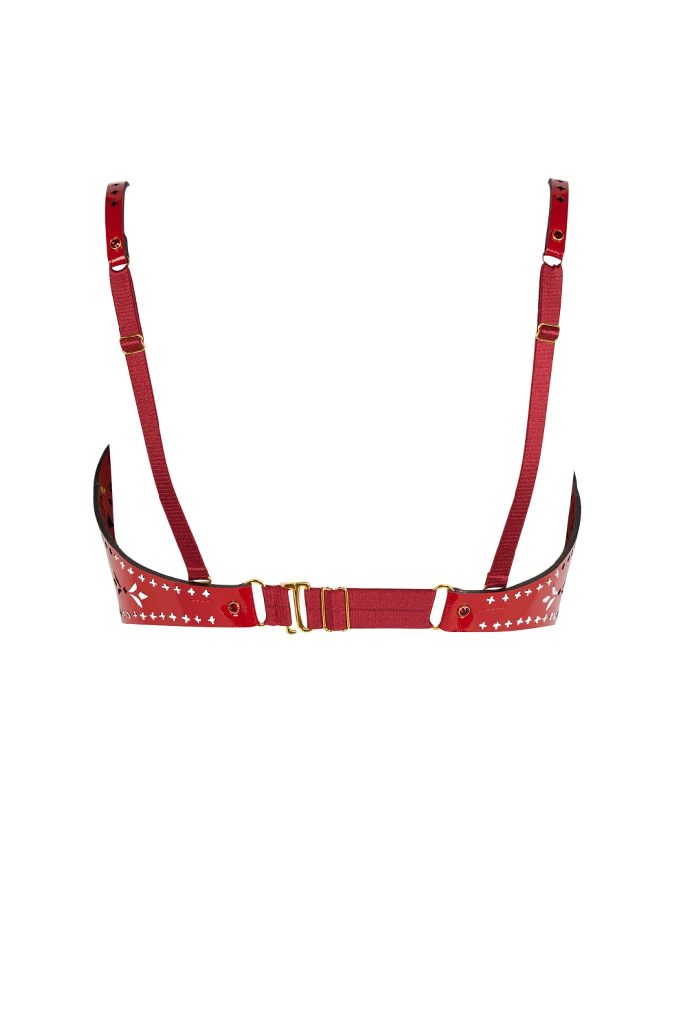 - Custom Laser Cut Red Patent Leather Bra Harness