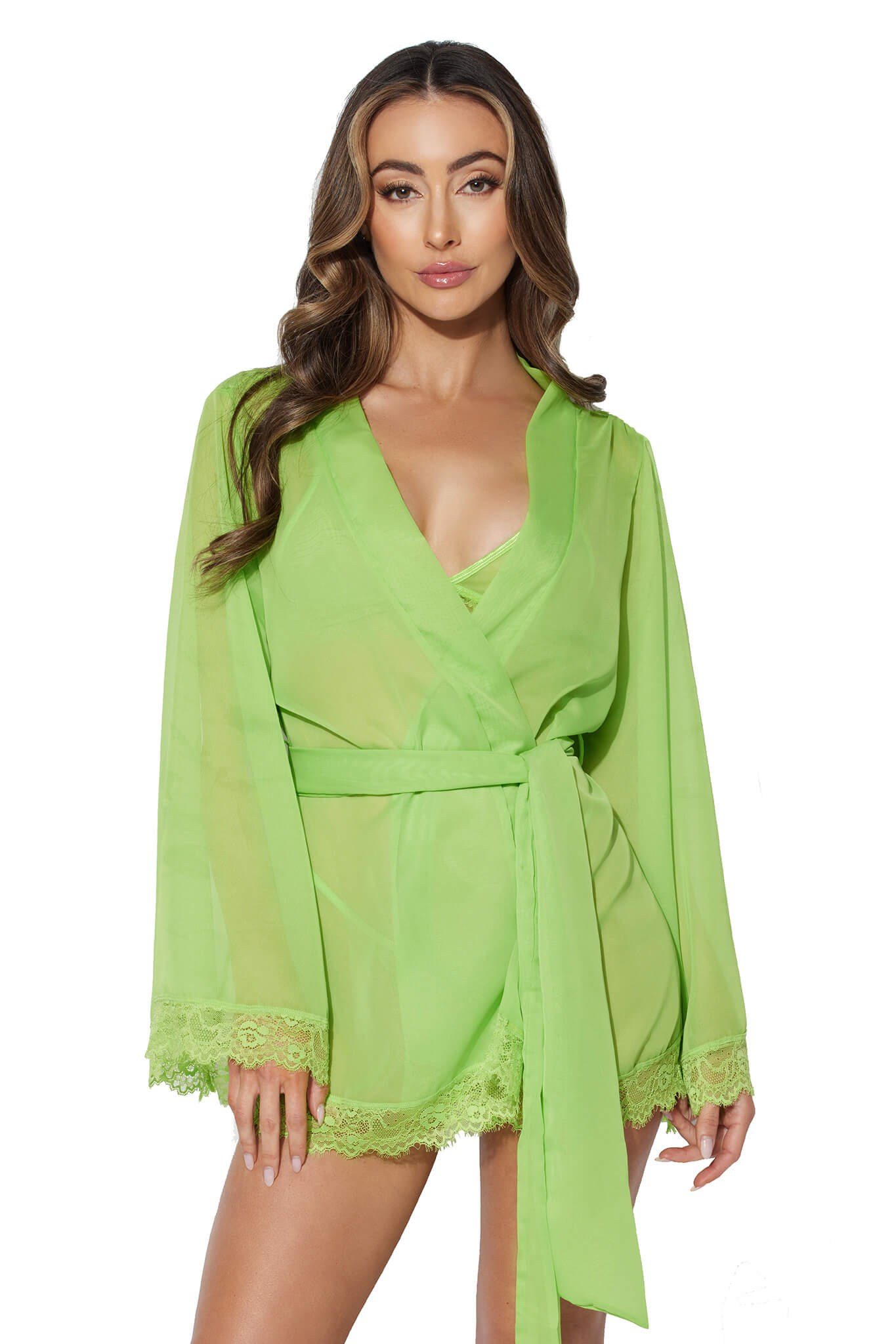 Wrap yourself in luxury with the Shavon Mesh Robe Set, an alluring three-piece ensemble that includes a delicate mesh robe, a soft lace bra, and a matching thong. This set, crafted in a vibrant lime green, exudes elegance and sophistication.