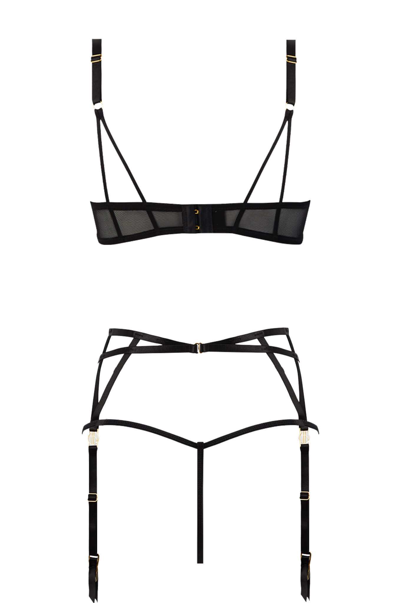 Strap in with the Ashley Alexiss Open Cup Bra set, featuring an open cup bra rocking fierce appliqué lace, a rebellious strappy elastic garter belt flaunting custom gold House of Desire logo hardware, all teamed up with a matching mesh and appliqué lace G-string. It’s not just lingerie; it’s a statement.
