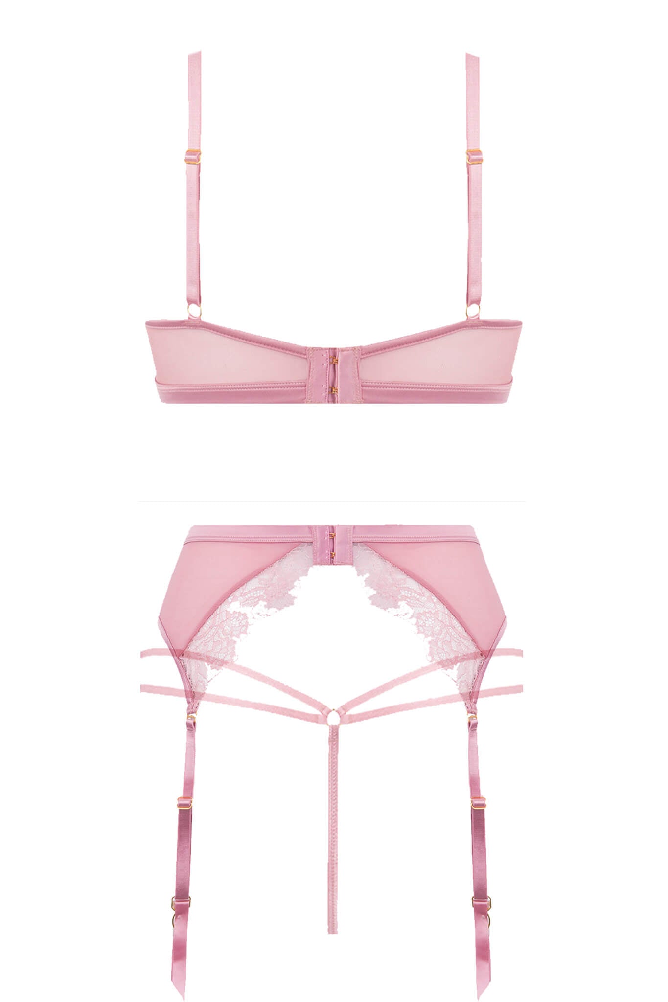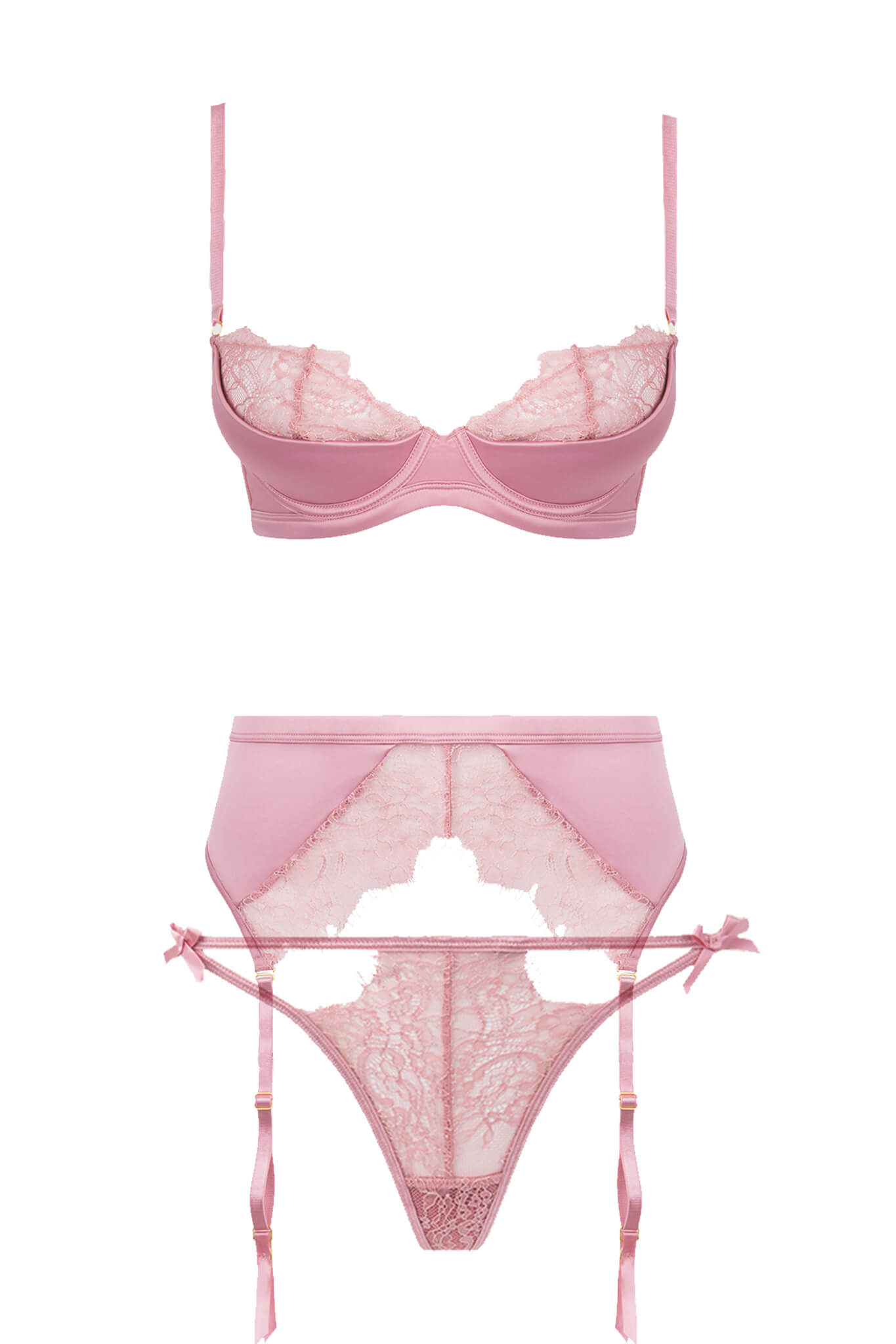 Drenched in a delicate blush hue, this set marries satin-soft fabrics with intricate lace details, embracing your silhouette with effortless grace. The meticulously designed garter belt offers an exquisite touch, its sheer lace panels and satin straps creating a sensual harmony that frames and enhances your natural curves.