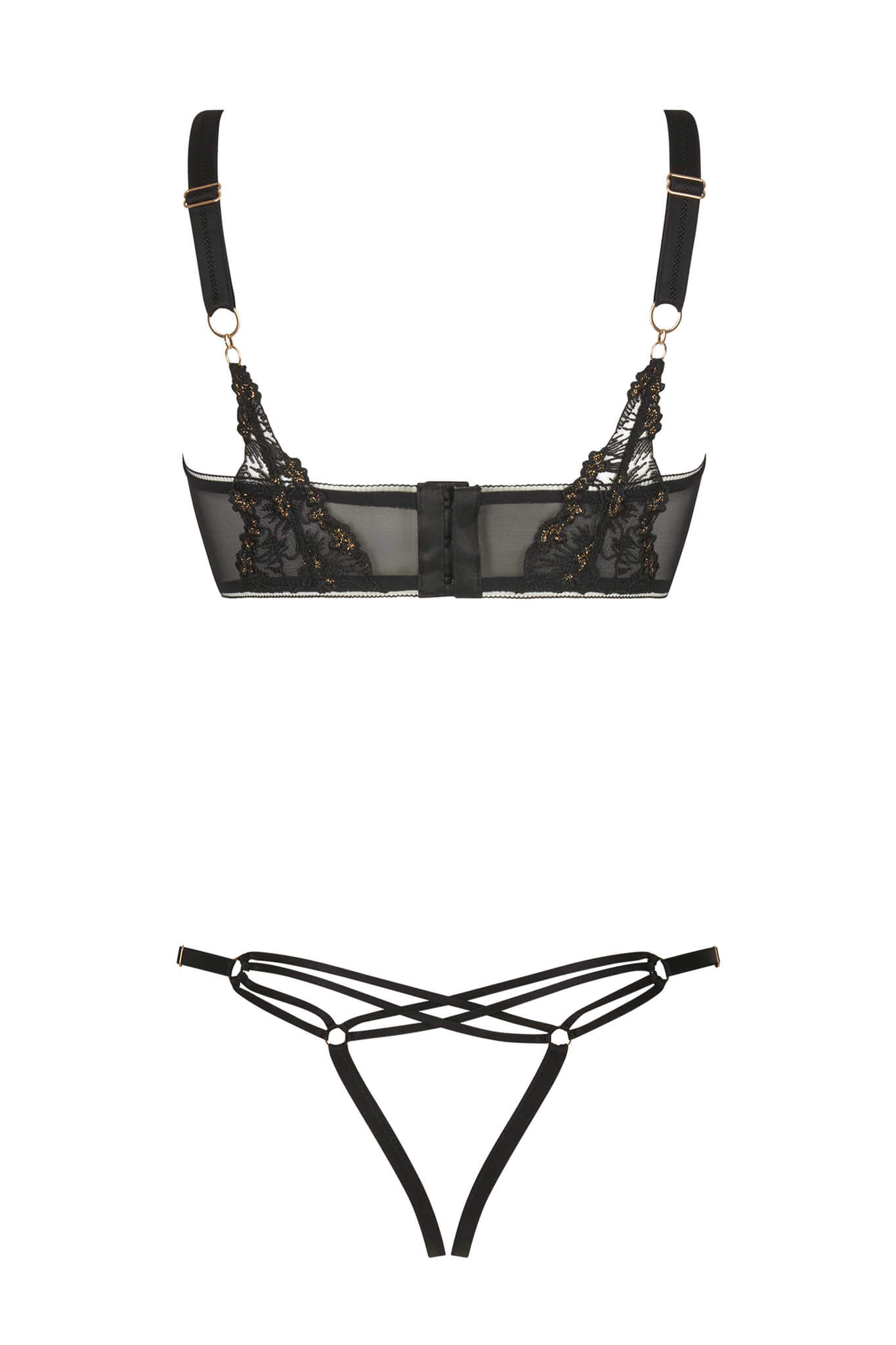 Bra in black stretch tulle embroidered with black and pink gold threads, mixed with stretch mesh. An enhancement for all breast shapes.