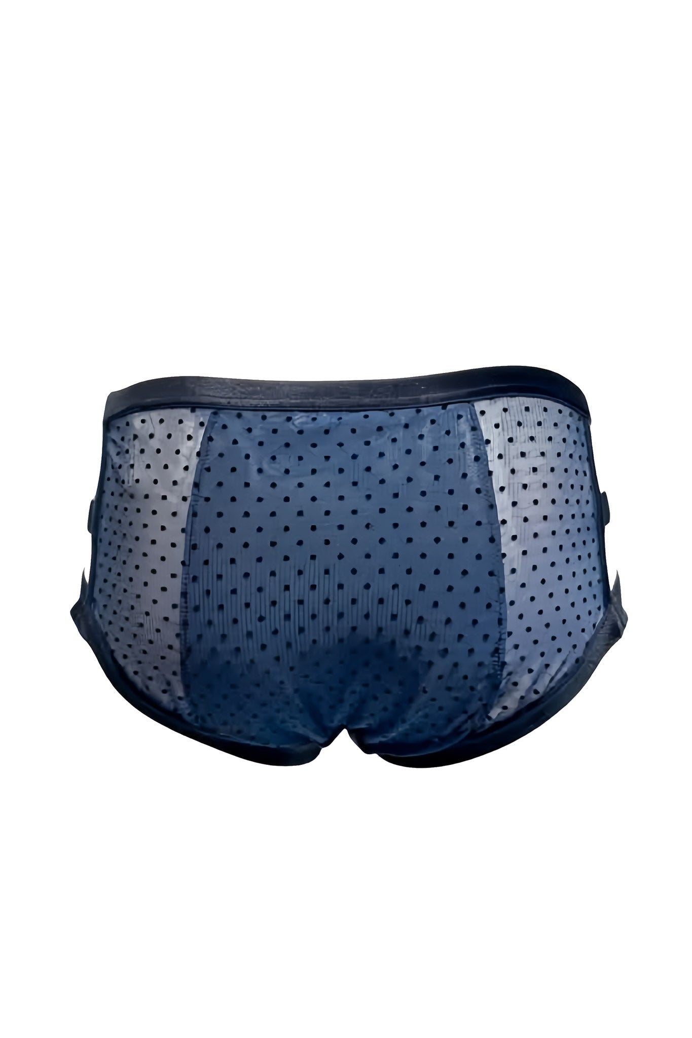 A perfect combination of style and functionality, these sanitary shorts are thoughtfully designed for comfort and elegance. The design varies by color, with the Navy featuring three side straps. The glossy fabric shimmers with varying shades depending on the angle, paired beautifully with flocked dot mesh on the back.