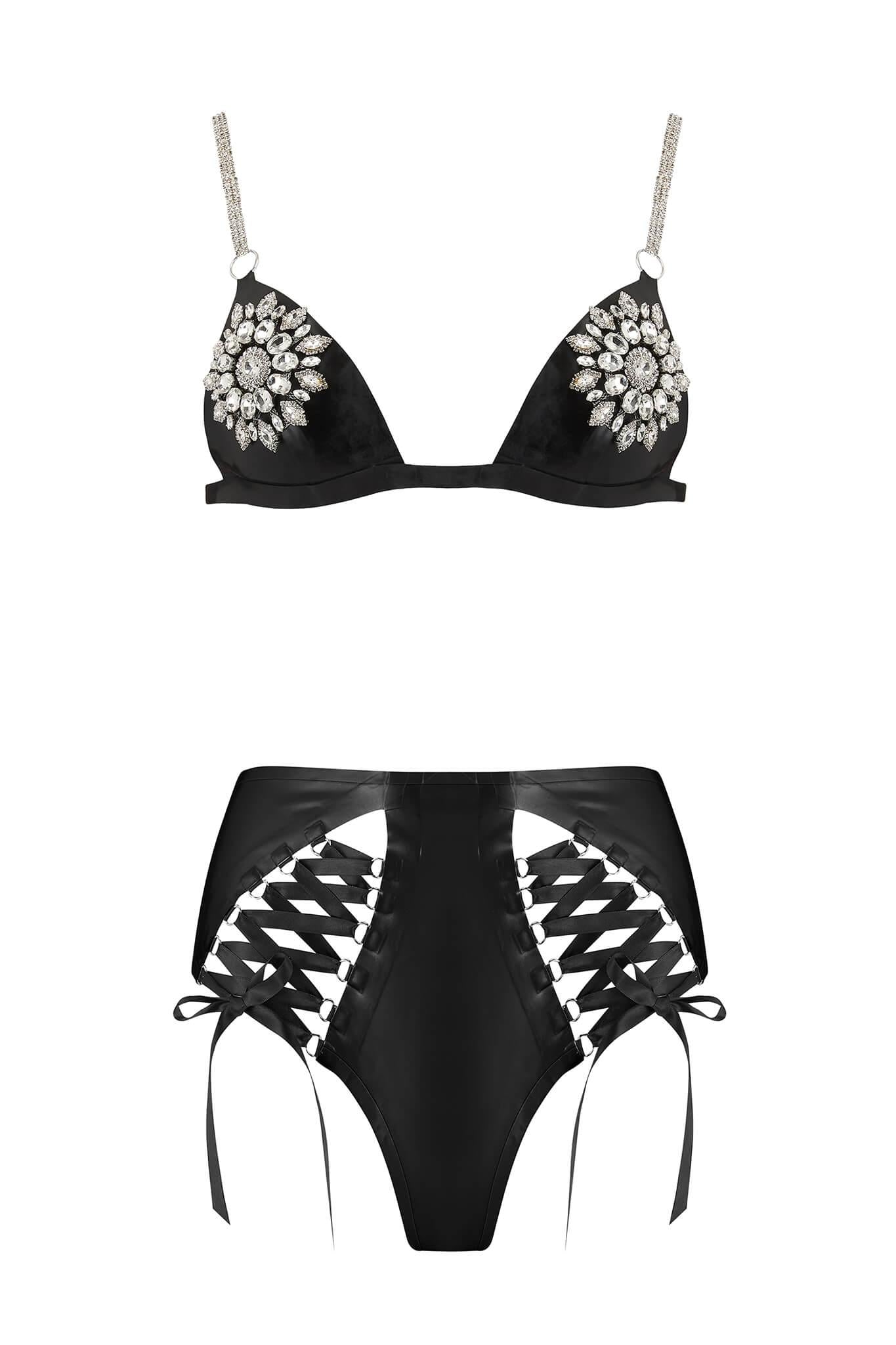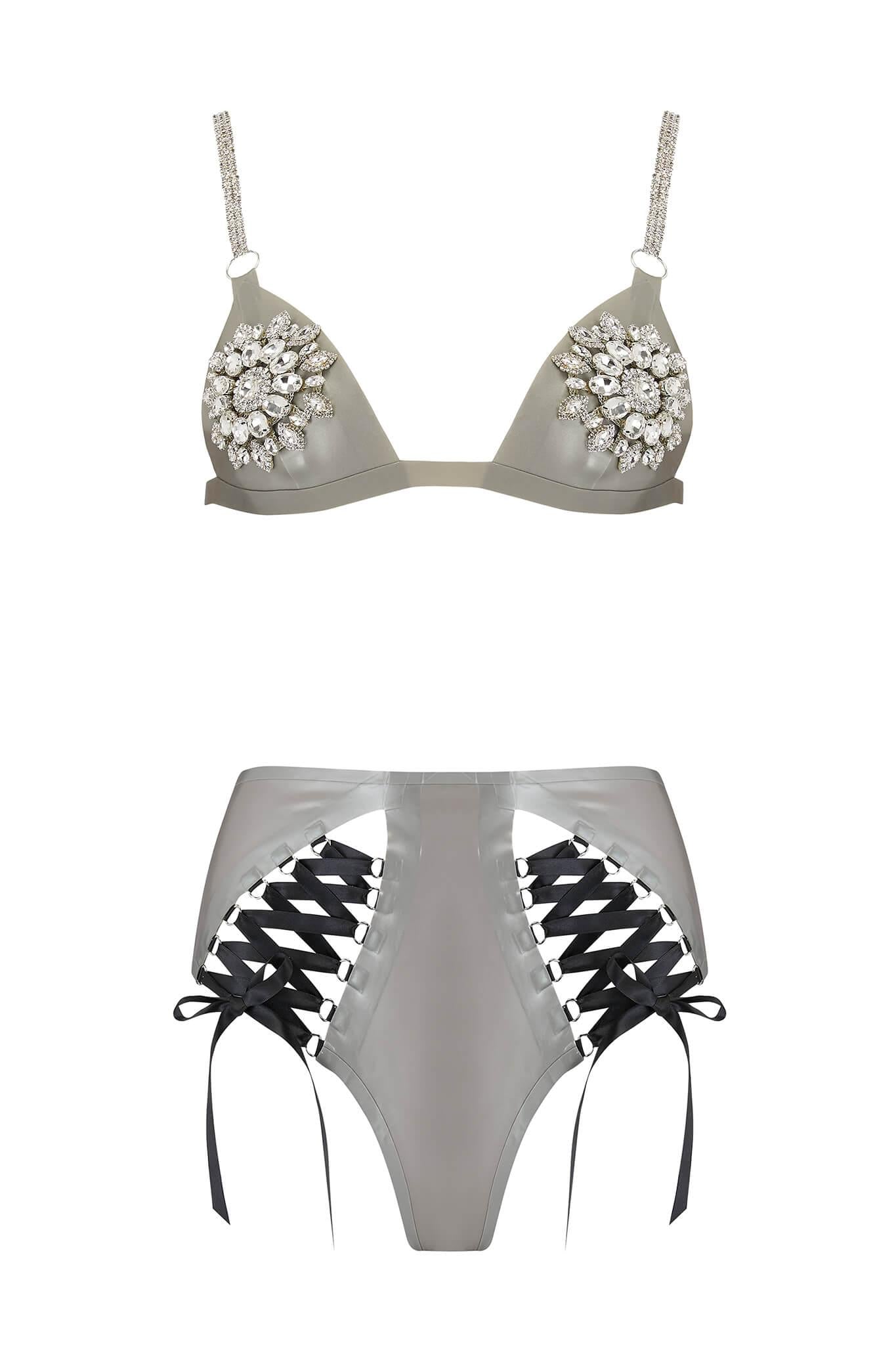 A Latex Lingerie Set like you have never seen it before. Featuring two exaggerated diamanté appliqués to the Mu Triangle Bra, jewel bra straps to match, and the high waisted Lambda Knicker tailored to perfection.