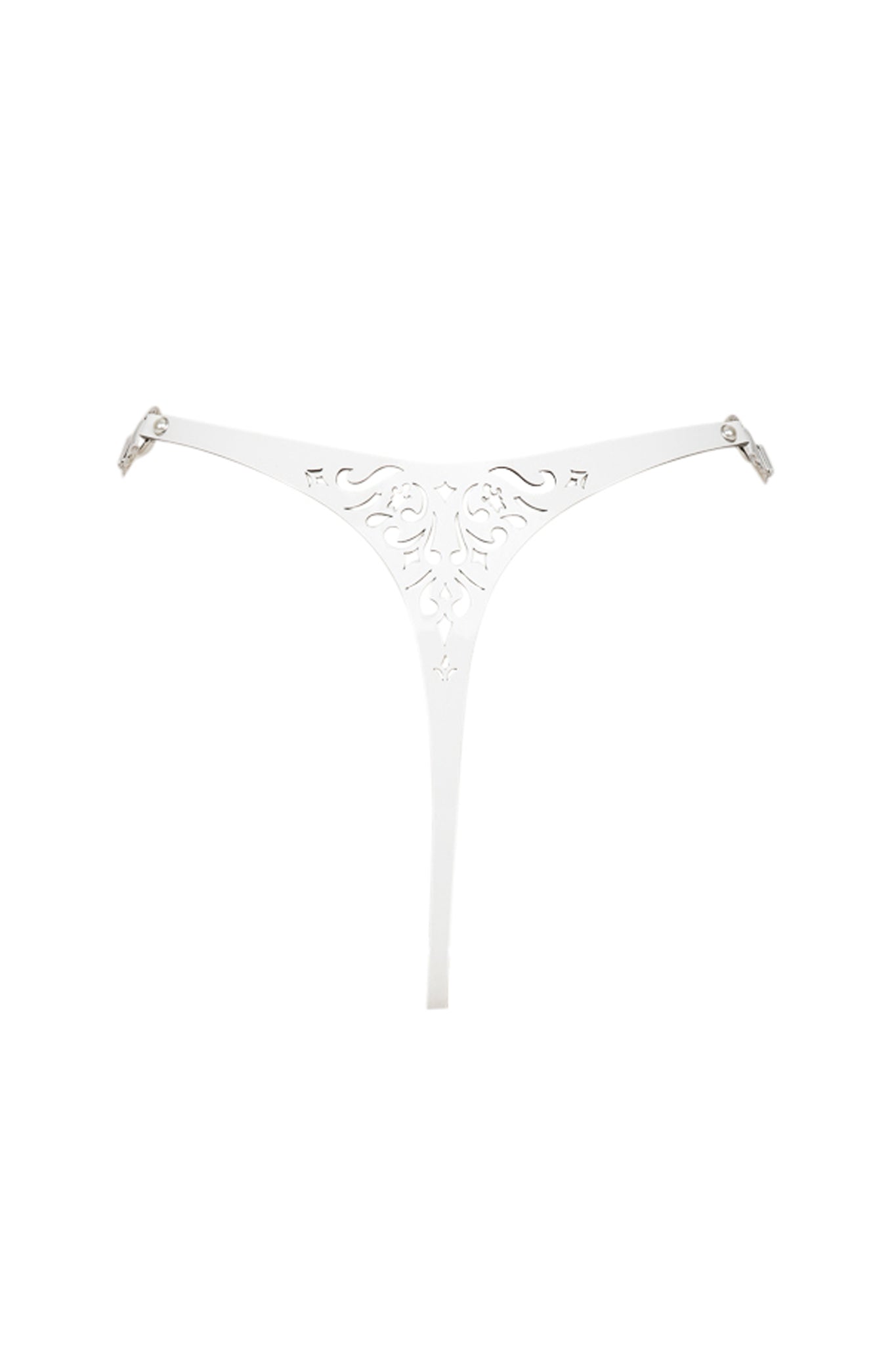 Chic & Seductive! Our Bianco String is handcrafted to order from white patent leather and ivory pearl rivets. Features adjustable double face satin elastic sides for easy size adjustments.
