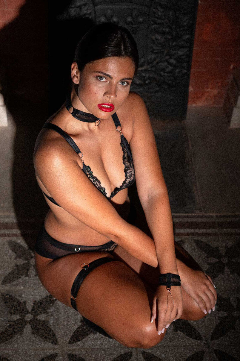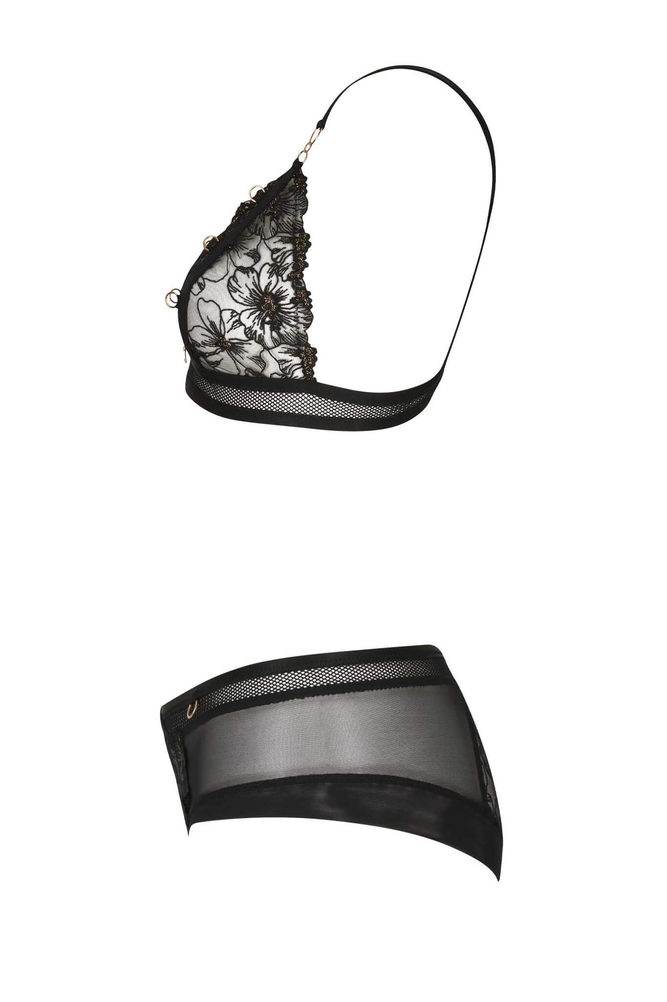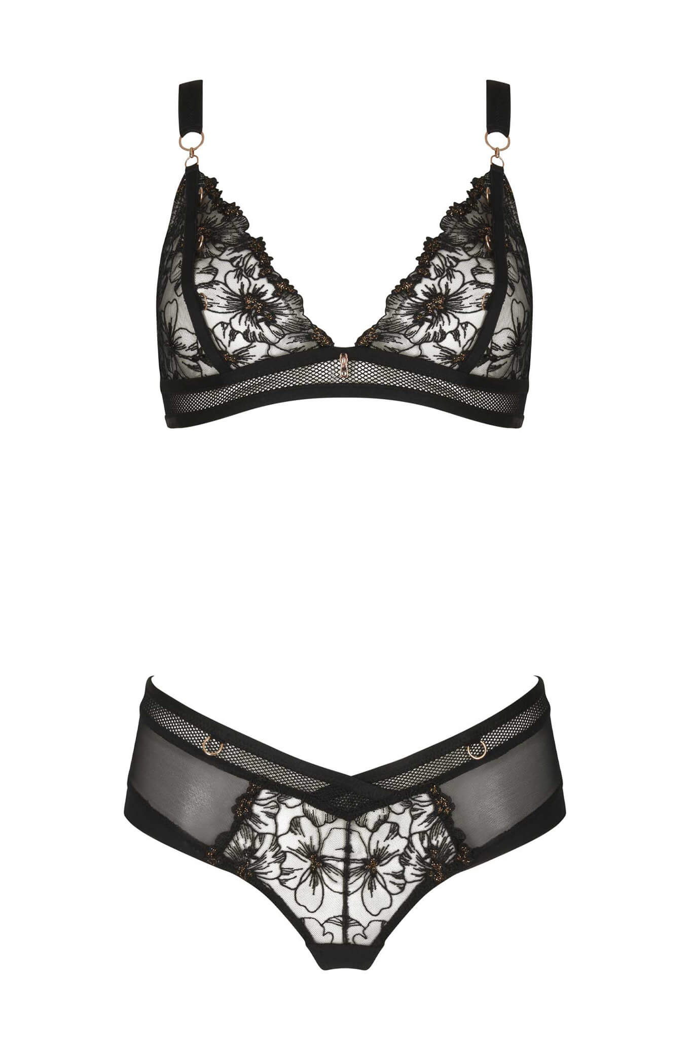 A jewel, sewn in the center of the neckline, completes this combination of finesse and provocation. The underbust band is entirely made of mesh to provide maximum comfort and an explicit provocative touch contrasting with the delicacy of the embroidery. The straps are adjustable and cross in the back, forming a deeply sexy and provocative.