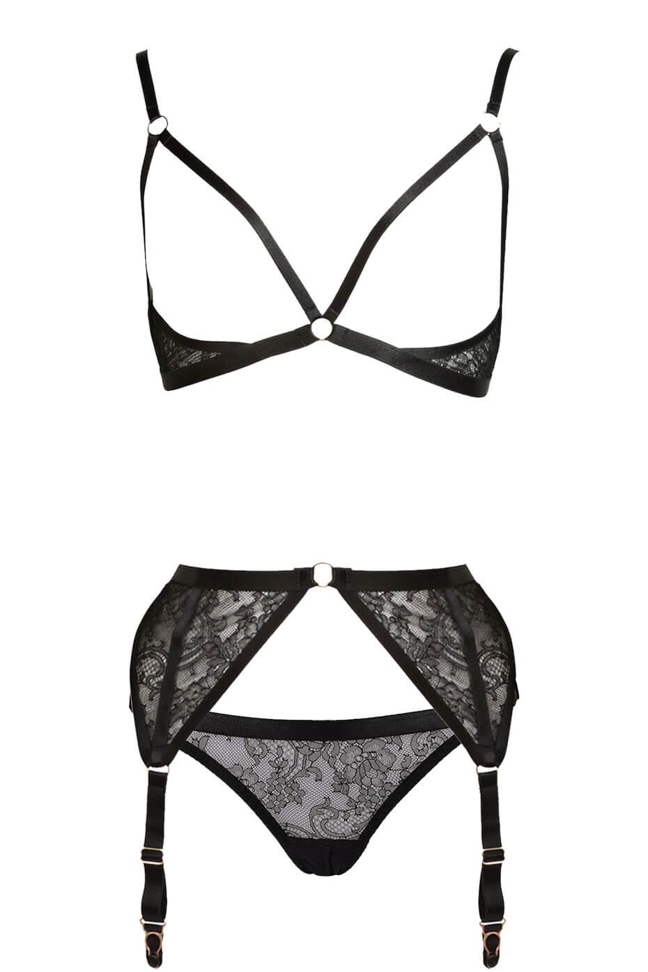 The flirtatious Annabel lace lingerie set uses French Chantilly lace to its advantage. Delicate French Chantilly lace inserts sit just under the bust on the harness bra in this set, which is finished with gold hardware and elastic. The simple yet elegant Chantilly lace on the thong sits against your skin while the powermesh thong style back ensures a comfortable fit. Its adjustable elastic sides and gold plated details give this thong a modern finish. As for the garter belt, this opulent suspender frames the figure with its modern design and strapping. Its lace pieces are finished with gold plated rings, whilst gold plated suspender ends and hooks for fastening at the back, top off this exquisite piece.