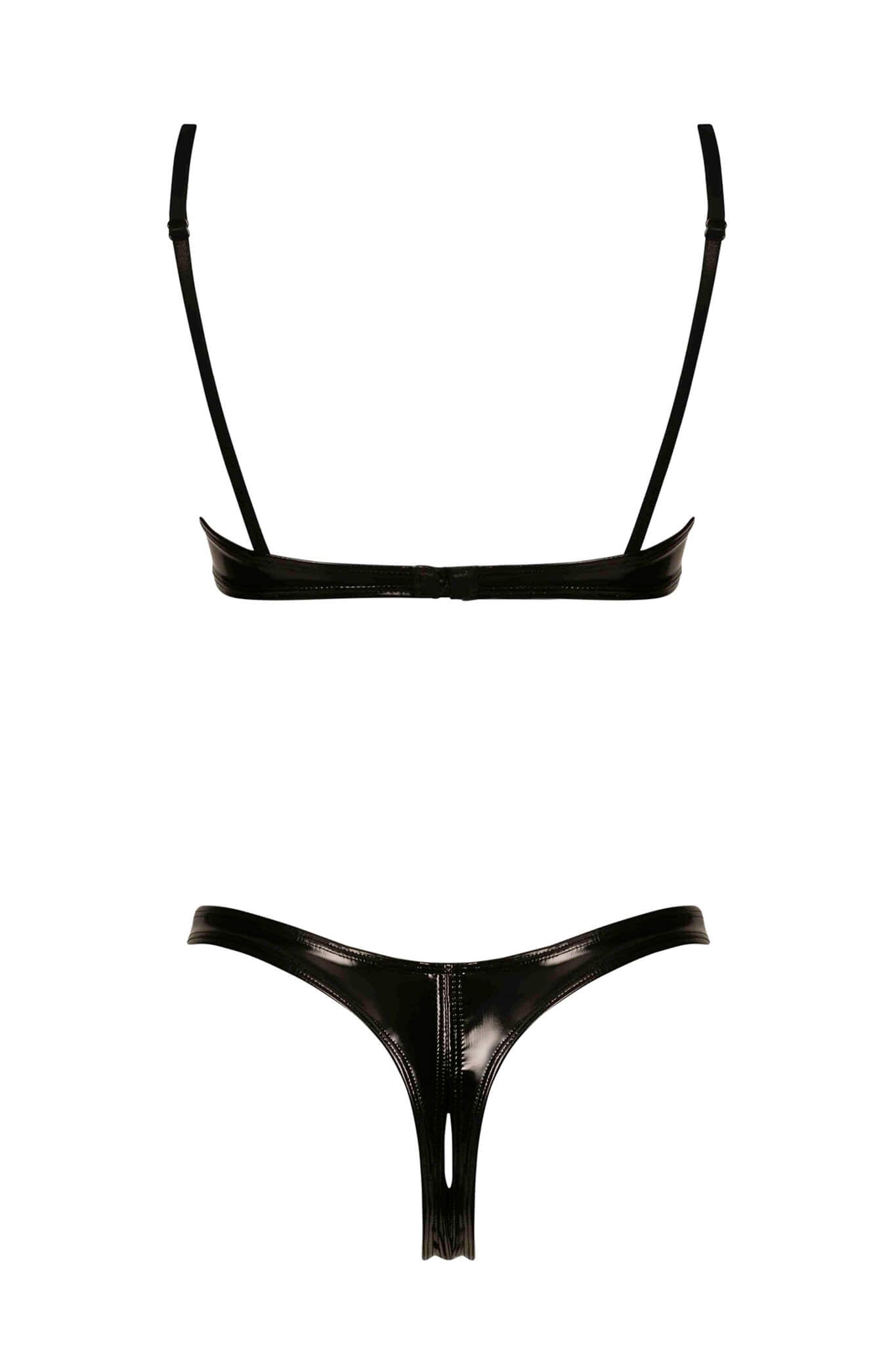 Sexy shiny lingerie set of open cup bra and matching g-string thong. Features matching shiny key-shaped jewels on the front of the bra and panty for exciting bedroom games. One of Micci’s Favorites.