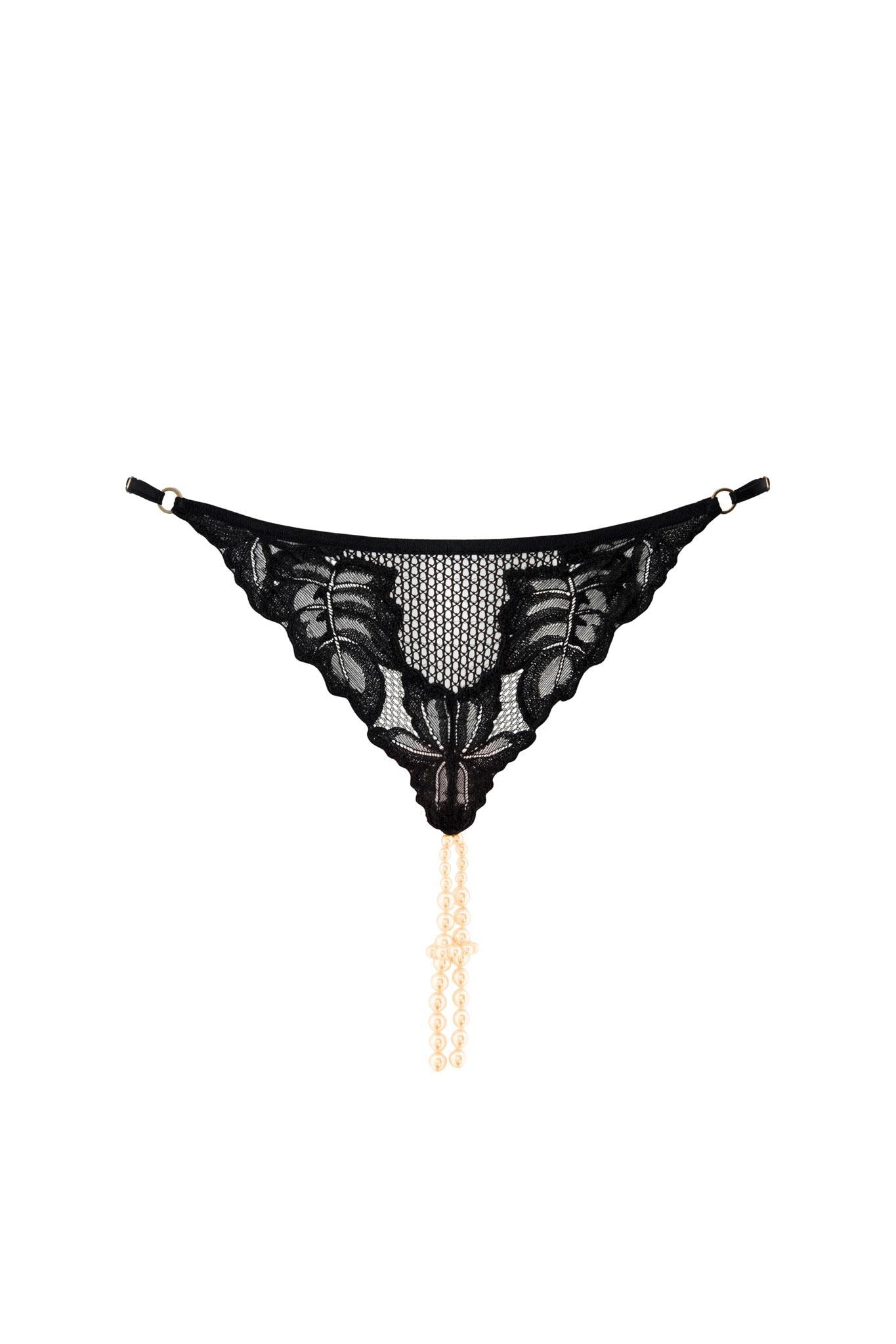 Pearl thong made with Leavers lace, tulle, satin elastic straps and gold components and sliders which help to adjust the garment to the woman silhouette. This is the most provocative thong of the London Collection.
