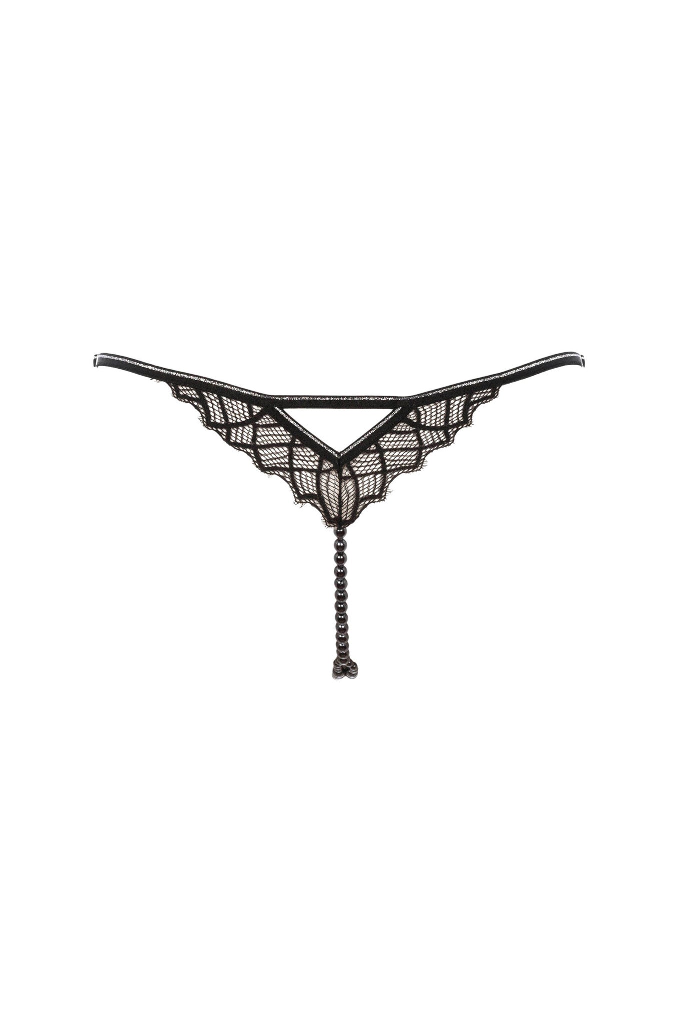G-string made of recycled Italian lace, super sheer tulle, elastic silver lurex straps and silver appliqués that allow the garment to be adjusted to each body. The most provocative and surprising garment of the Manhattan Collection, thanks to its sheer and eye-catching back design.