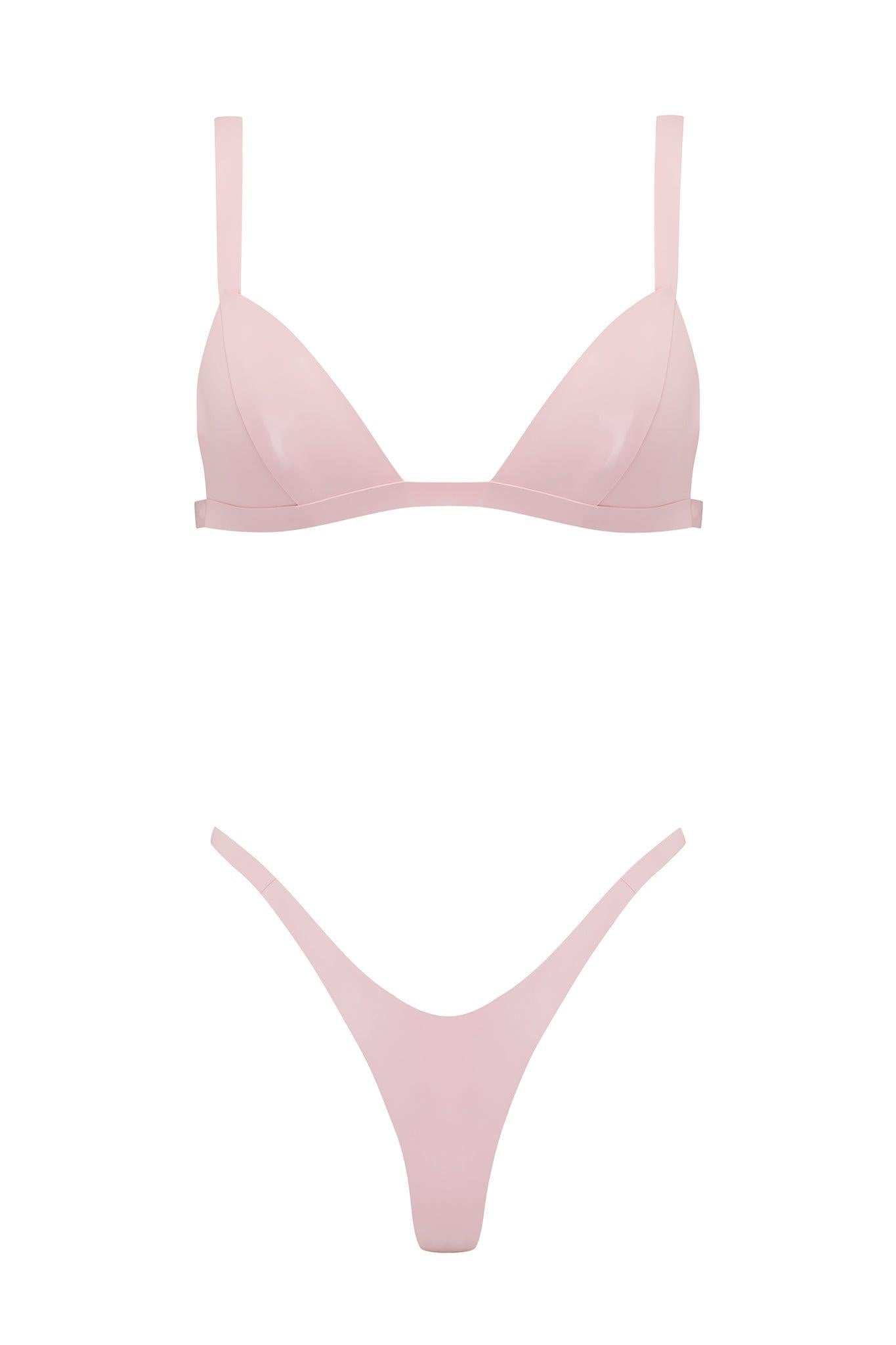 Our Baby Pink Latex Triangle Bra, created in double thickness quality latex and featuring a centre cup seam to add volume within the cup creates a beautiful minimal look. Paired with the Baby Pink Latex G-String to complete the look.