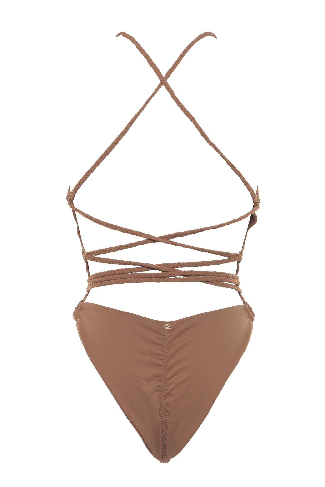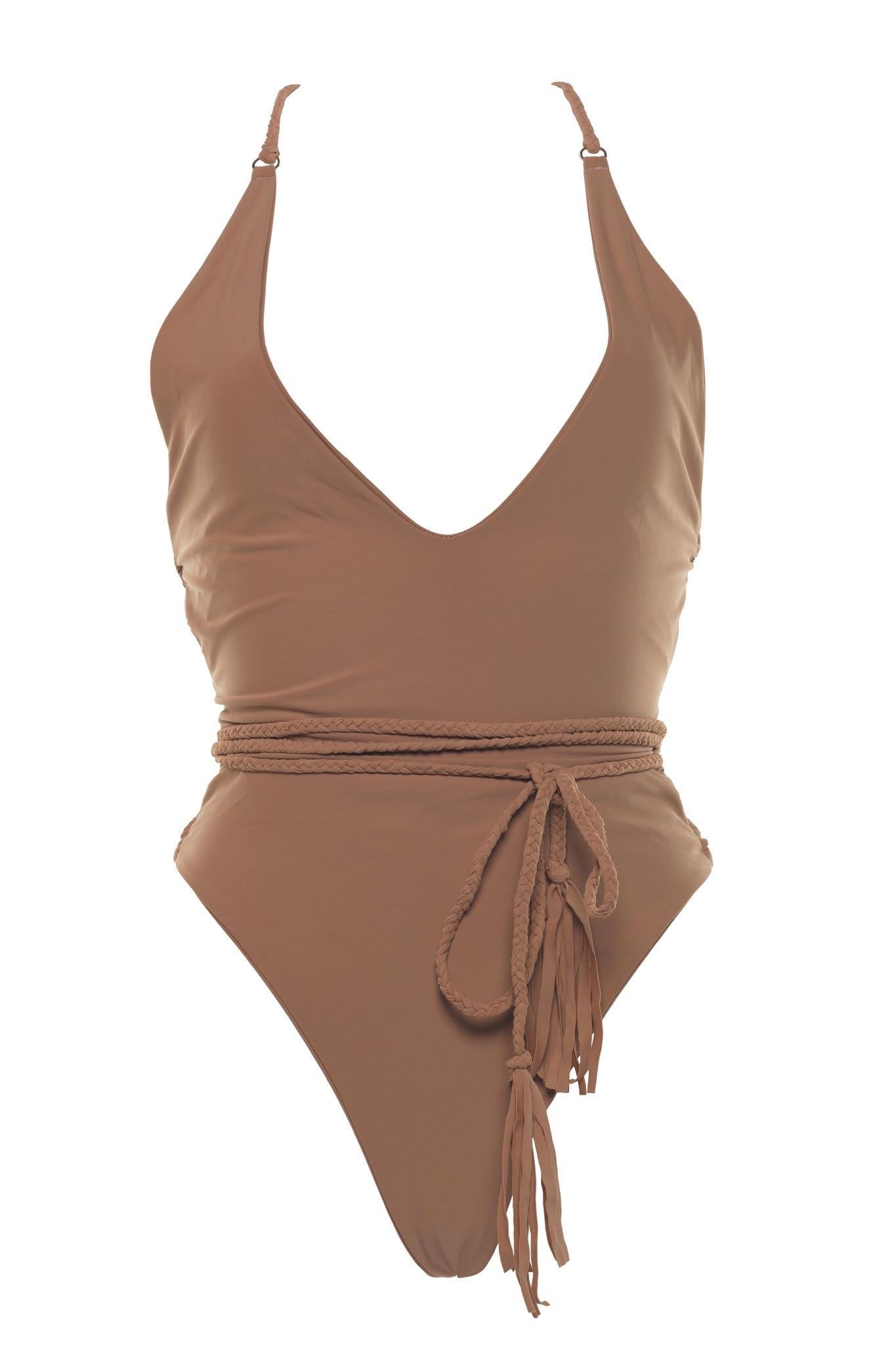 Plunging neckline with gold clasp and ring embellishment. Extra long braided strap woven through gold rings down the back for adjustable fit, this piece is made from the signature, supple, skin hugging Demery Jayne Collection pink rose quartz fabric. One of a kind seamless style, with backless design, scrunch back bottom seam.