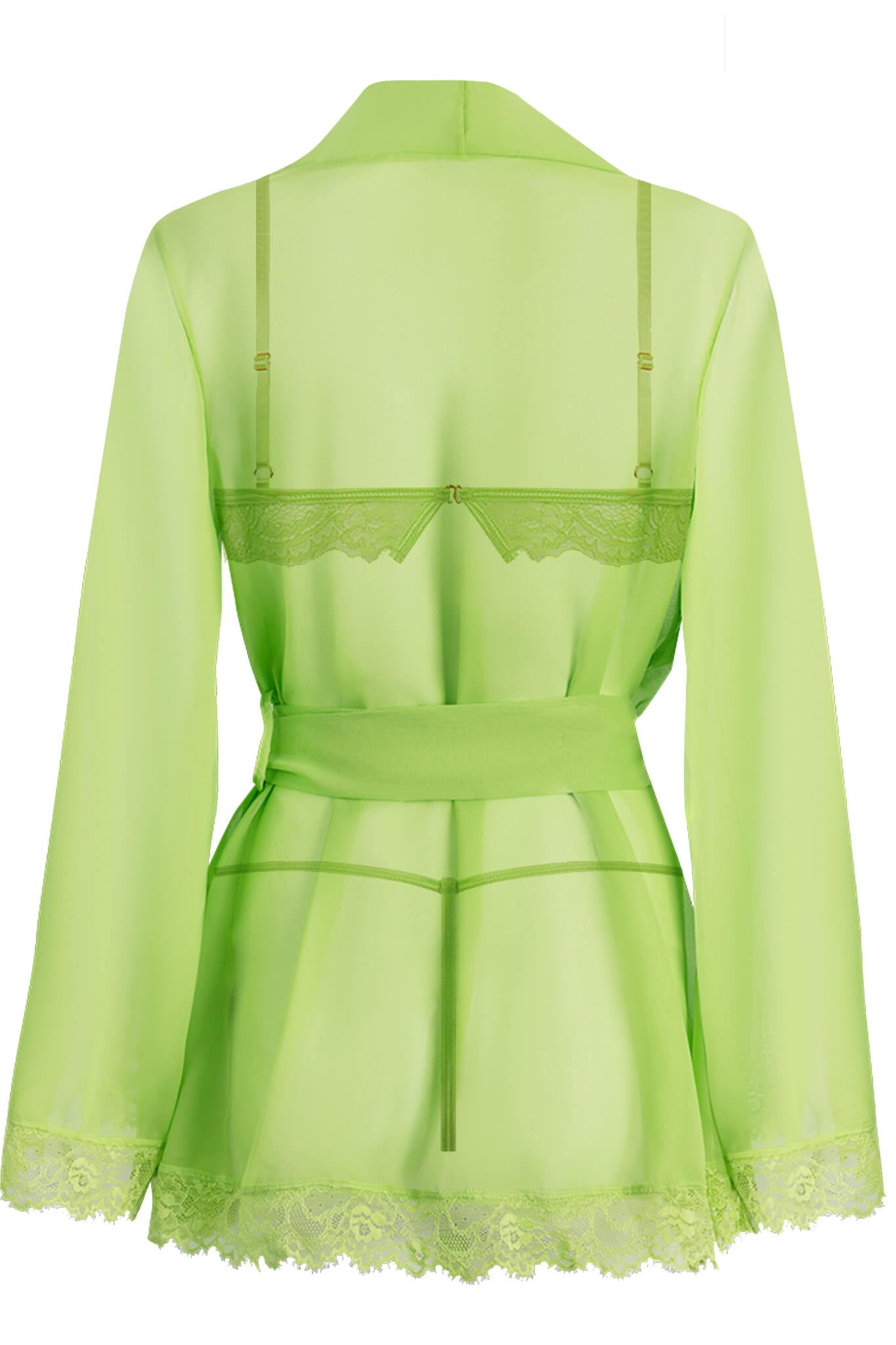 Wrap yourself in luxury with the Shavon Mesh Robe Set, an alluring three-piece ensemble that includes a delicate mesh robe, a soft lace bra, and a matching thong. This set, crafted in a vibrant lime green, exudes elegance and sophistication.