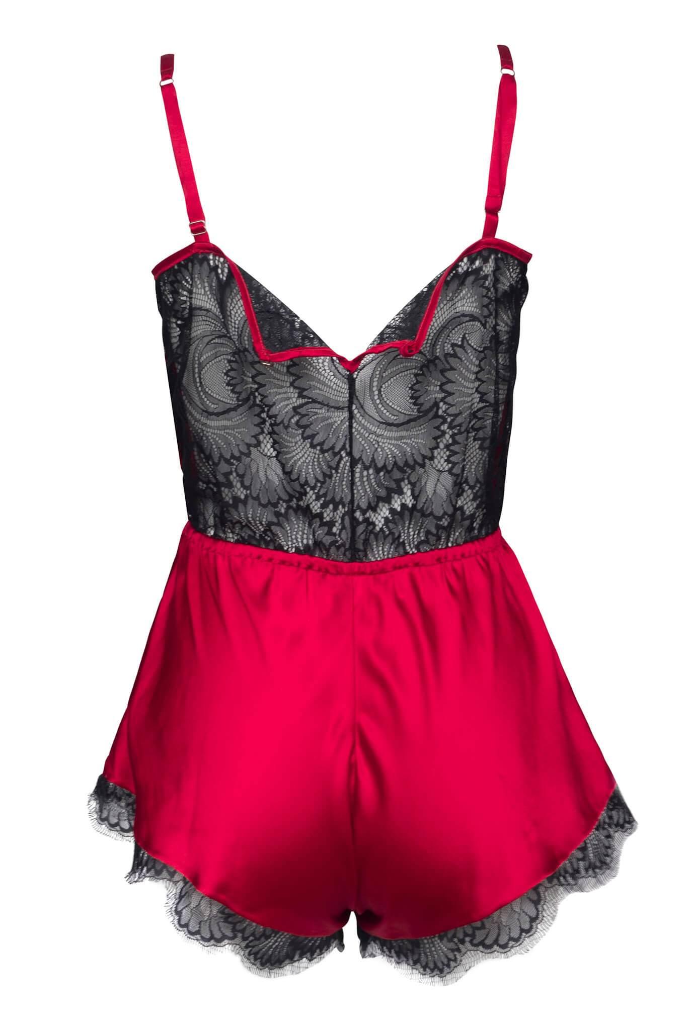 Our glamorous Pleasure Romper silhouette is as functional as it is sexually alluring. Provocative eyelash lace inserts and seductive placements paired with a luscious silk charmeuse accent the shape of the female form beautifully.