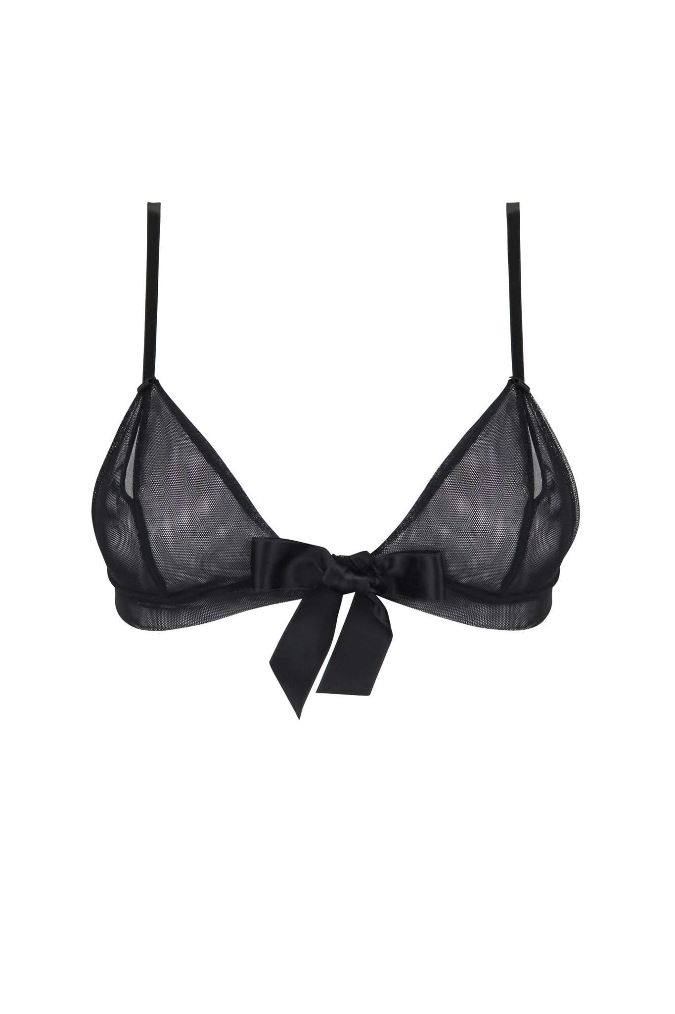 Beautiful black tulle power-net fabric for a chic and comfortable triangle style bra. Transparencies and bonded borders for a perfectly invisible underwear while the luxurious overlapped model cup allows a very sensual experience. With satin bow detailing, finished in high stretch adjustable straps and adjustable three position hook closure. Part of the Ava Haute Couture Lingerie Set.