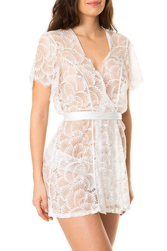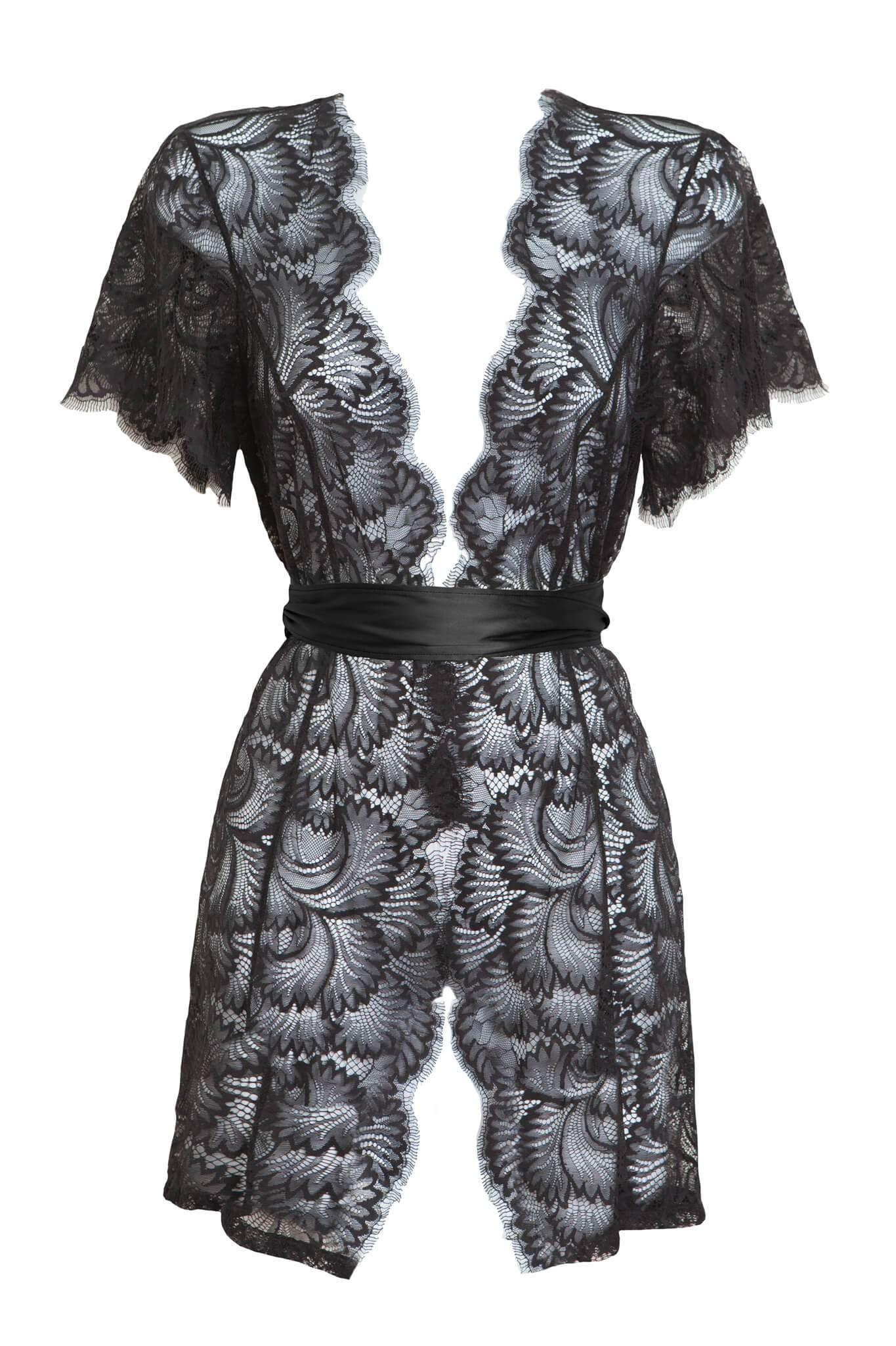 Arousing the timeless dark romantic you’ll move through the bedroom with purpose in this seductive bed jacket, crafted from deliciously delicate eyelash lace and silk charmeuse. Made to be worn over anything or nothing at all, this piece adorns the body for a day of play or a night in for one.