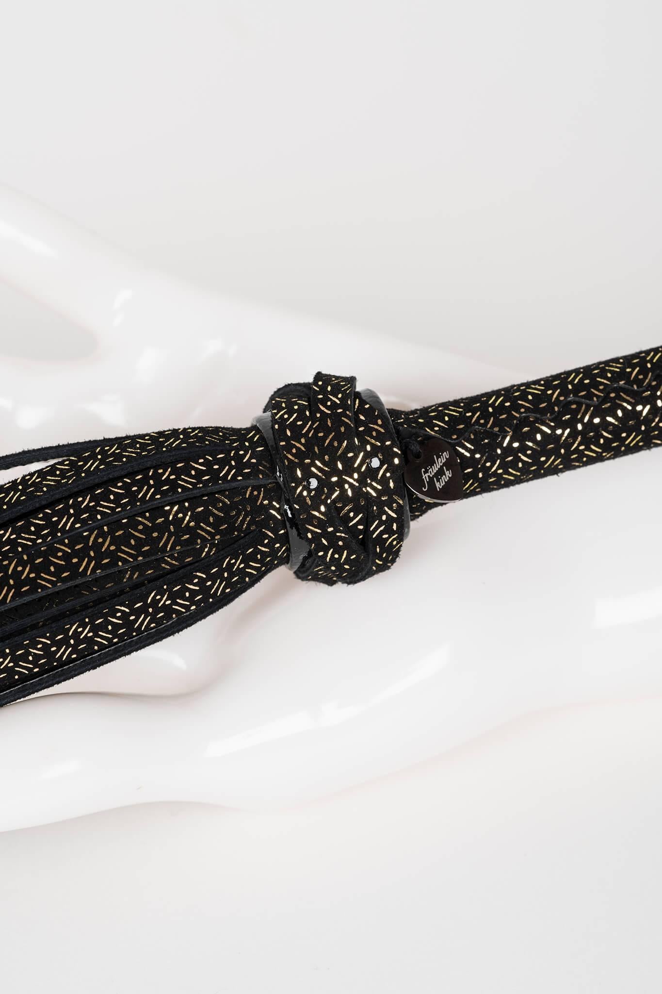 Excite and Tease with the ultimate luxury bedroom accessory! Our Lush Flogger is hand crafted from luxurious black leather with gold foil print. Swarovski® clear gold rimmed crystal rivets are the perfect finishing touches for this high fashion kinky accessory.