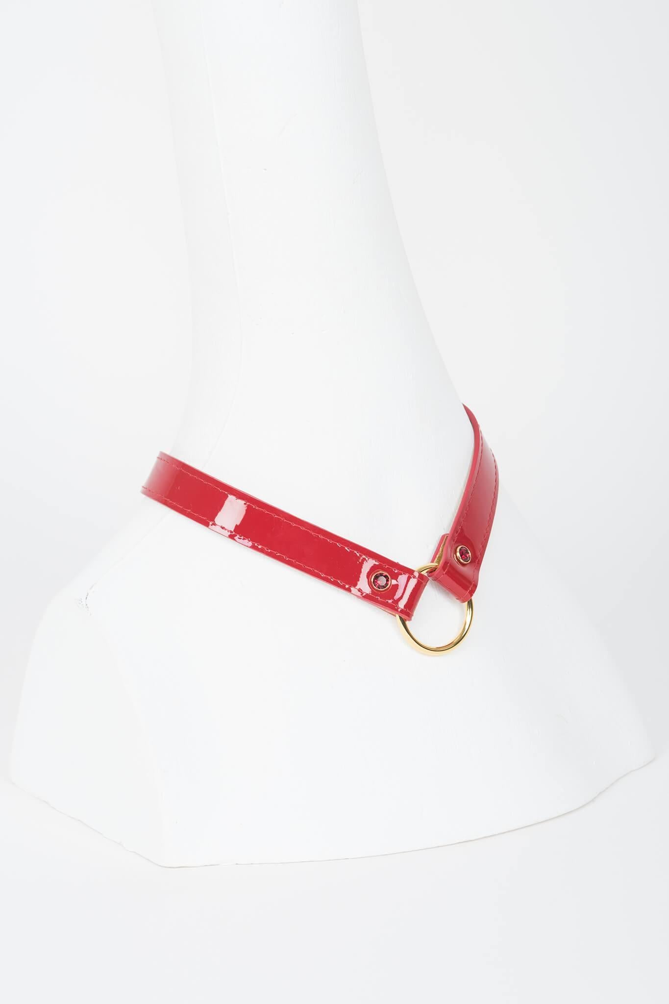 Our Red Hot Collar will add a perfect touch of high fashion fetish glamour to your favorite outfit. Featuring shiny red patent leather, 18K gold trims and Swarovski® Red Siam Gold rimmed rivets. This is the ideal statement piece!