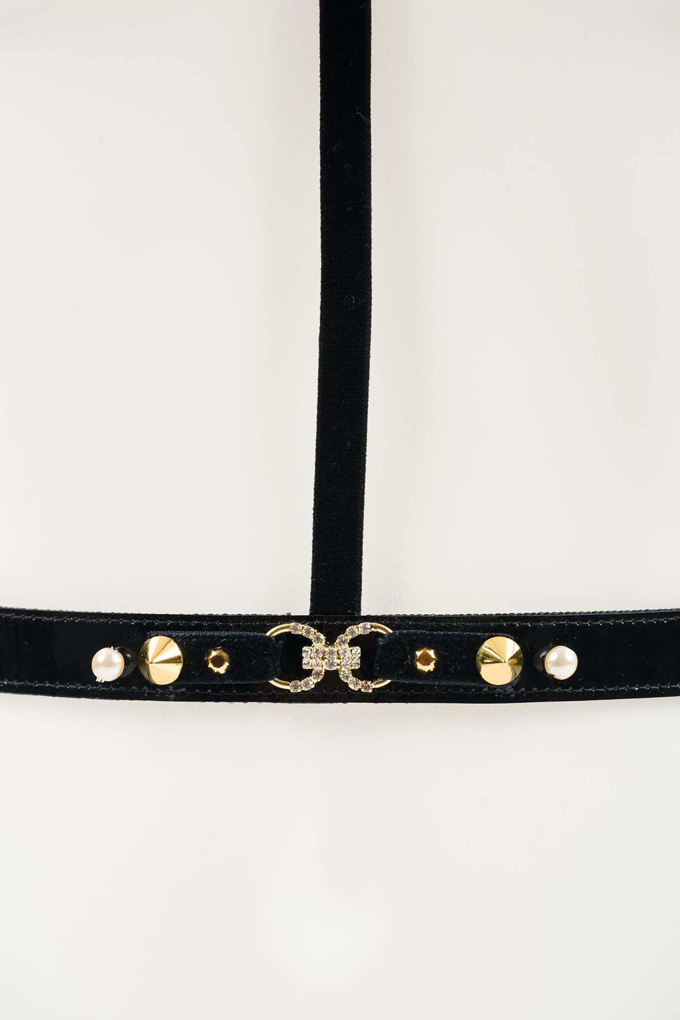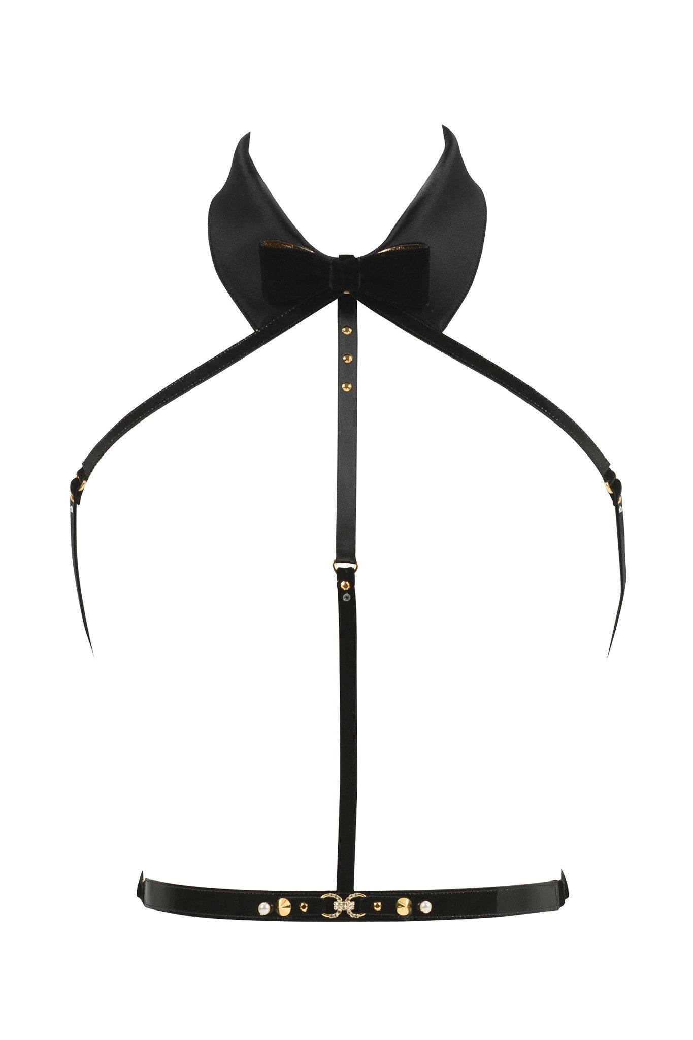 Our Tuxedo Harness is the ultimate high fashion fetish accessory. Featuring SWAROVSKI® crystals & a detachable gold leather lined bow tie, this harness will make you feel sexy and confident. Wear this chic harness over a black dress or under a blazer to add a touch of glamour to your board room meetings.