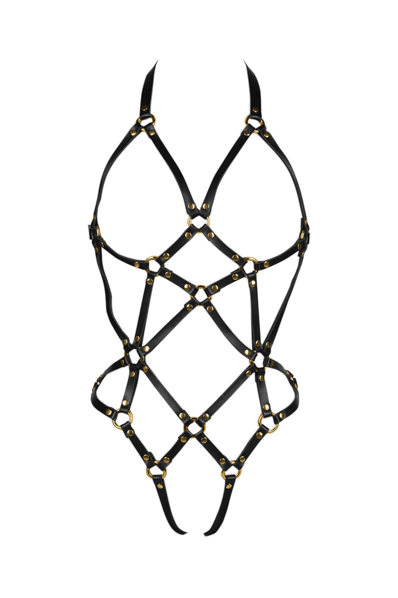 The open cup and crotch design looks naughty and leaves little to the imagination. Is the bondage body itself a little too daring for your taste? Combine the leather body with your favorite lingerie or a transparent bodysuit.