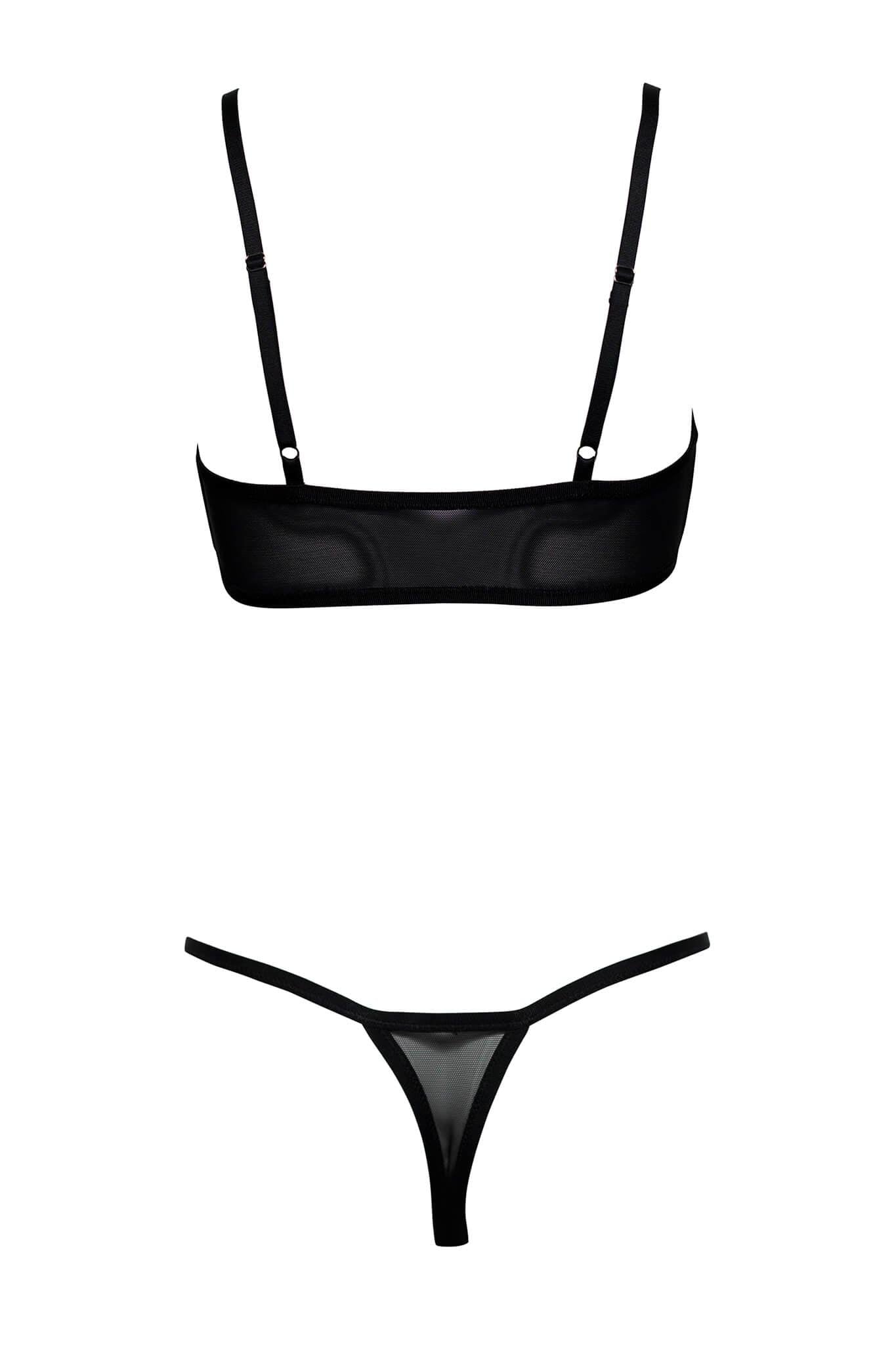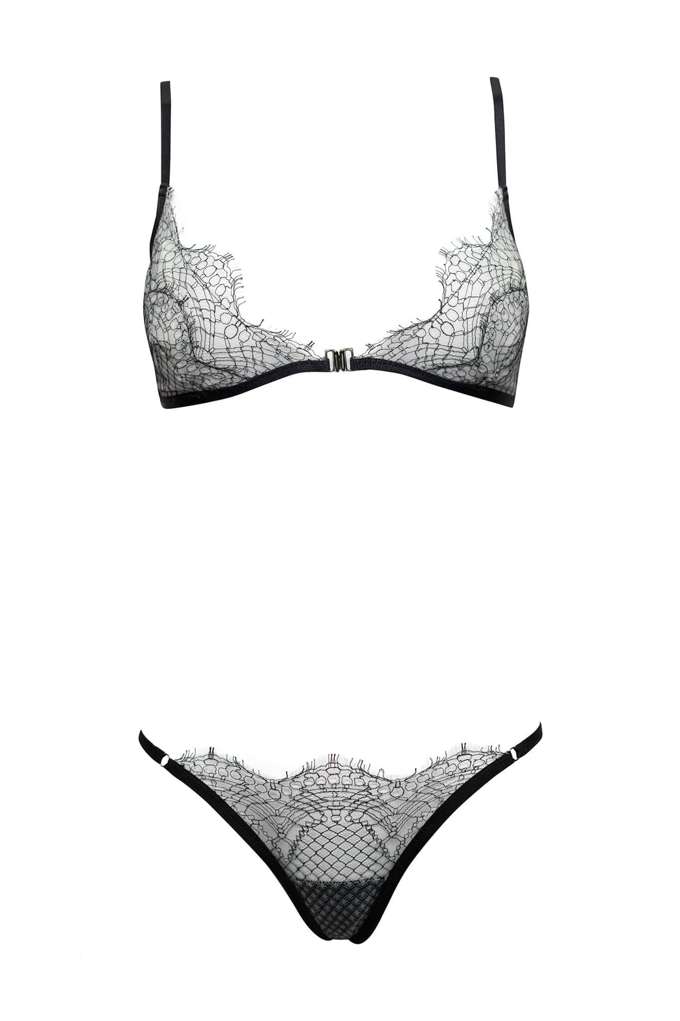 French web lace soft cup with soft net lining. Center front closure and sheer mesh back. Fully adjustable straps. Paired with the Charlotte Thong, which features a French web lace front body with grosgrain elastic string-style straps along hips.