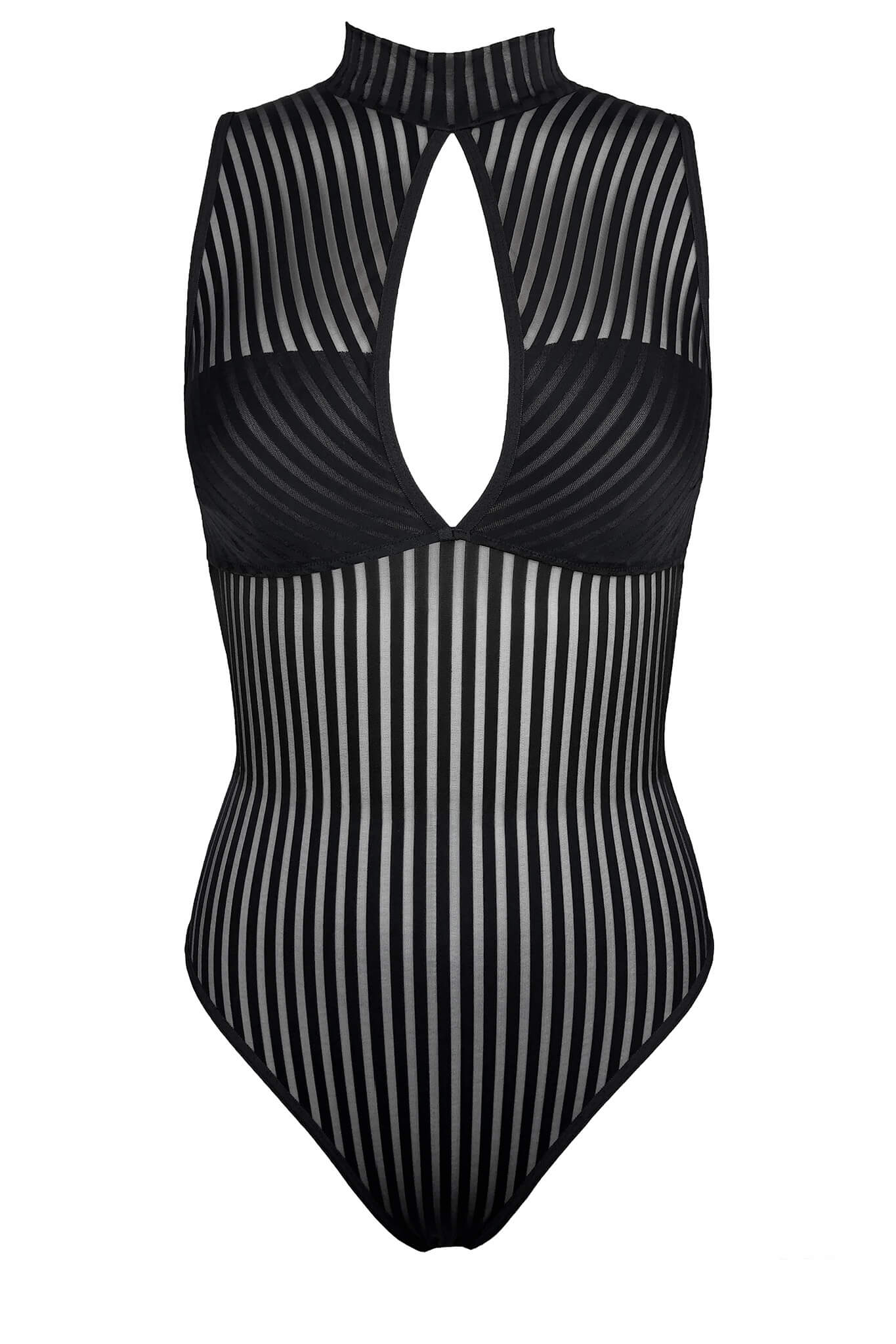 This bodysuit is a flawless essential in your wardrobe. Made to layer or wear on it's own! Designed with a curve enhancing vertical, sheer and opaque striped pattern, and a square bust lining. Bottom snap closure for easy wear. Constructed with a flattering high neck, a cut-out in the bust, and a cut-out in the back, wear this bodysuit from day to night.