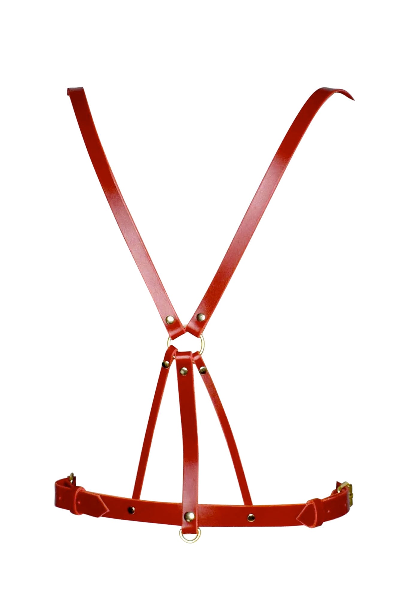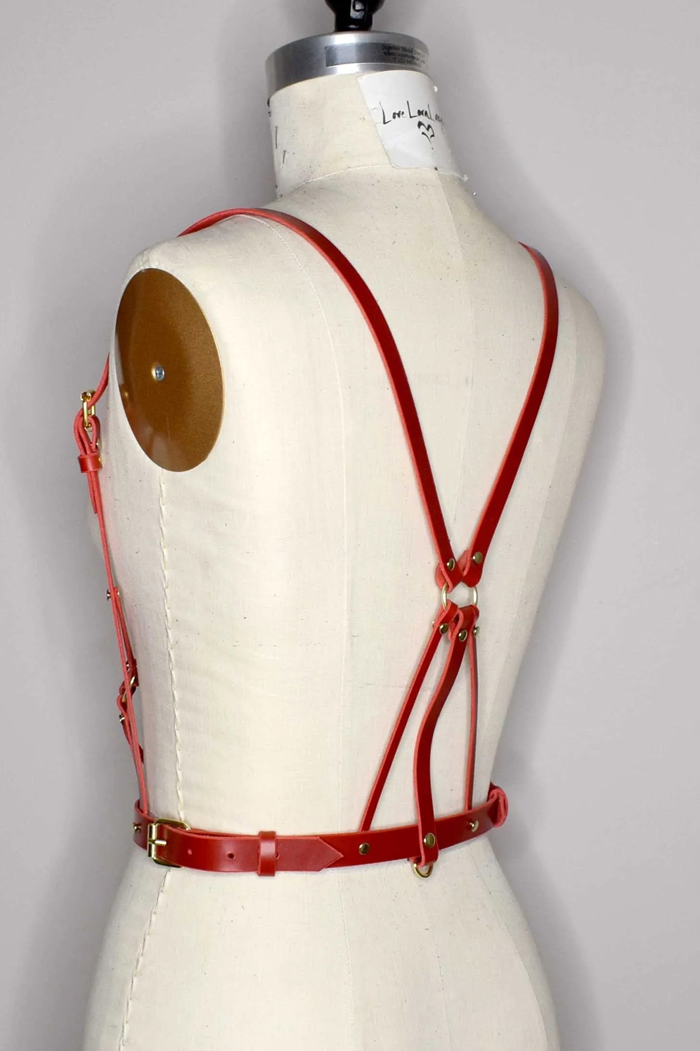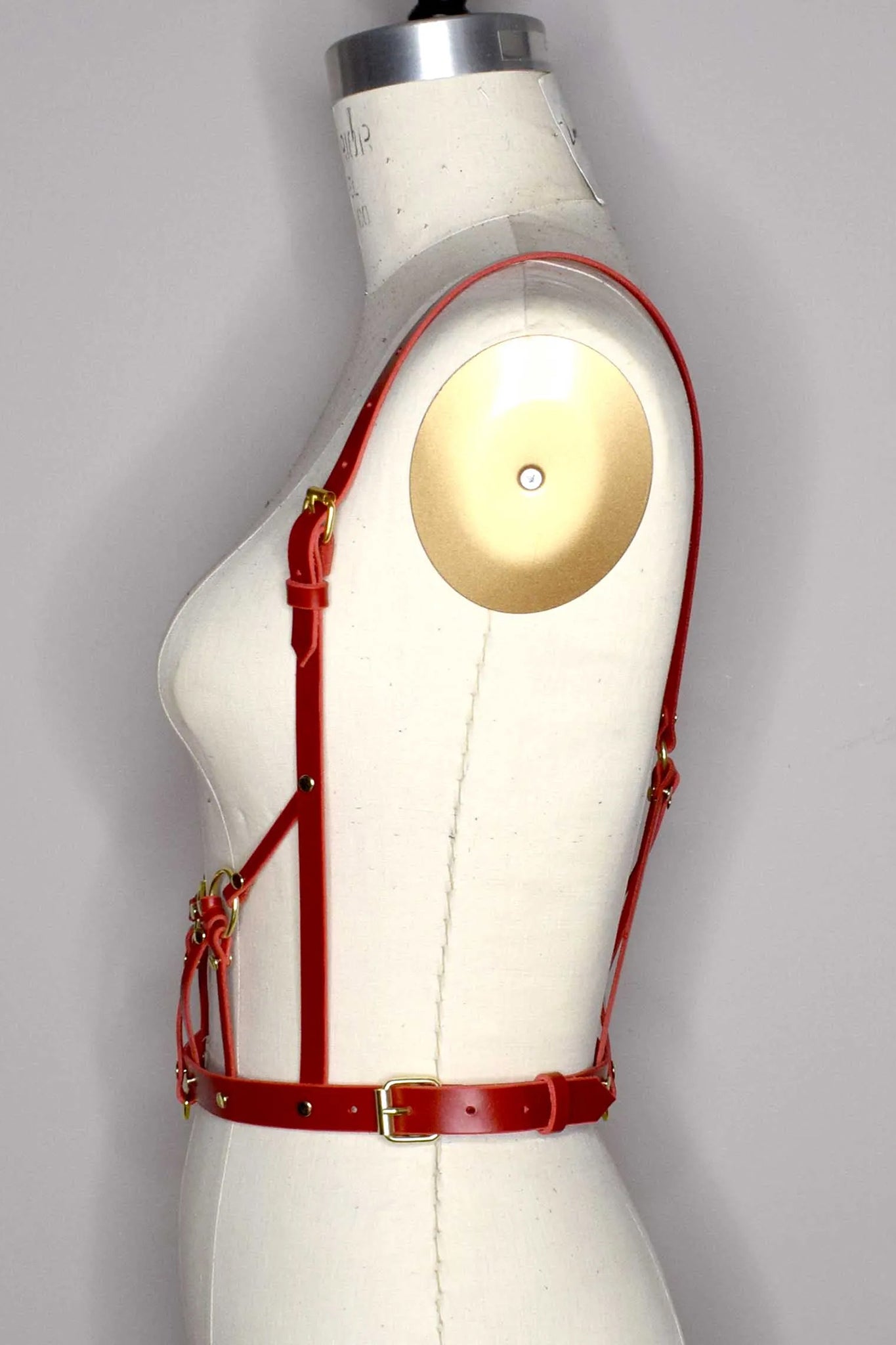 Welcome to a revolutionary new way to show off your style. The Inanna Strappy Leather Harness Bodice is crafted with luscious Italian vegetable tanned leather for an ultra-smooth and firm feel. Featuring hand beveled edges for comfort, a delicate geometric design at the front and O ring details, and double cap rivet construction for maximum sturdiness.