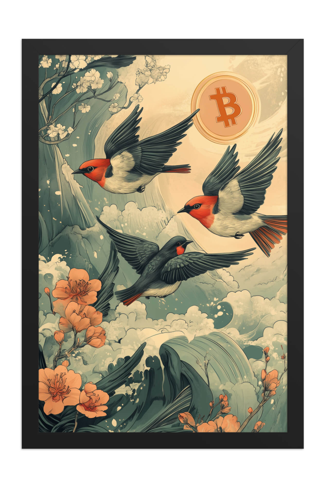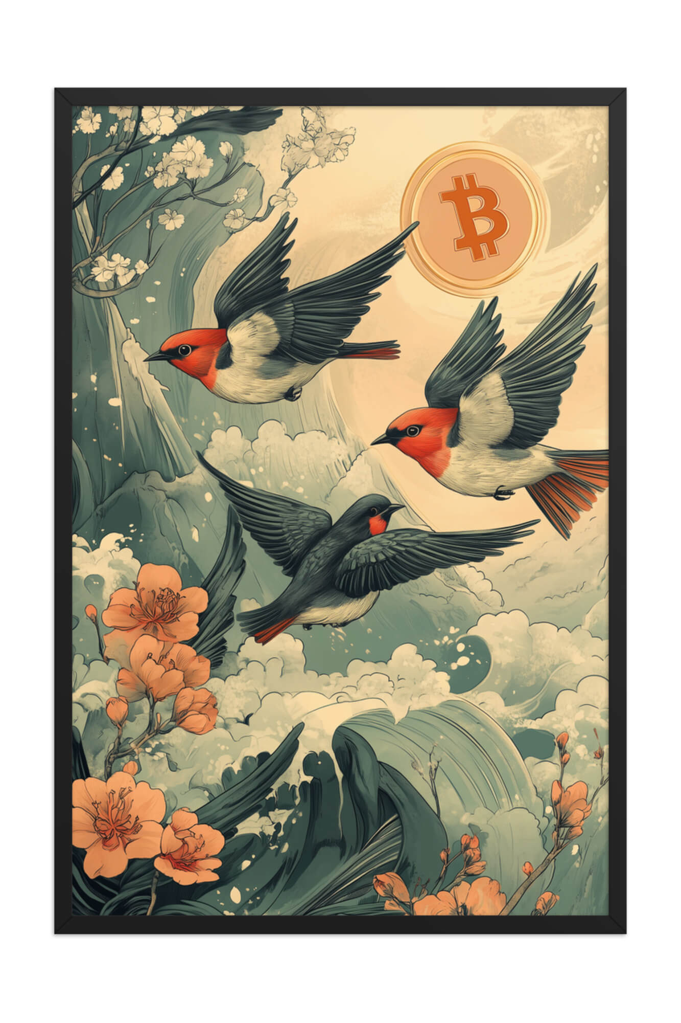 For Bitcoin enthusiasts and advocates of freedom, this poster is a declaration of belief in a system where individuals hold the reins of their financial destiny. The birds, soaring freely, represent the breaking away from the confines of centralized control, much like Bitcoin itself, which operates on a decentralized network, free from any single authority. The natural elements around them remind us of the purity and inherent nature of this freedom, suggesting that Bitcoin’s liberation is as natural as the flight of birds.