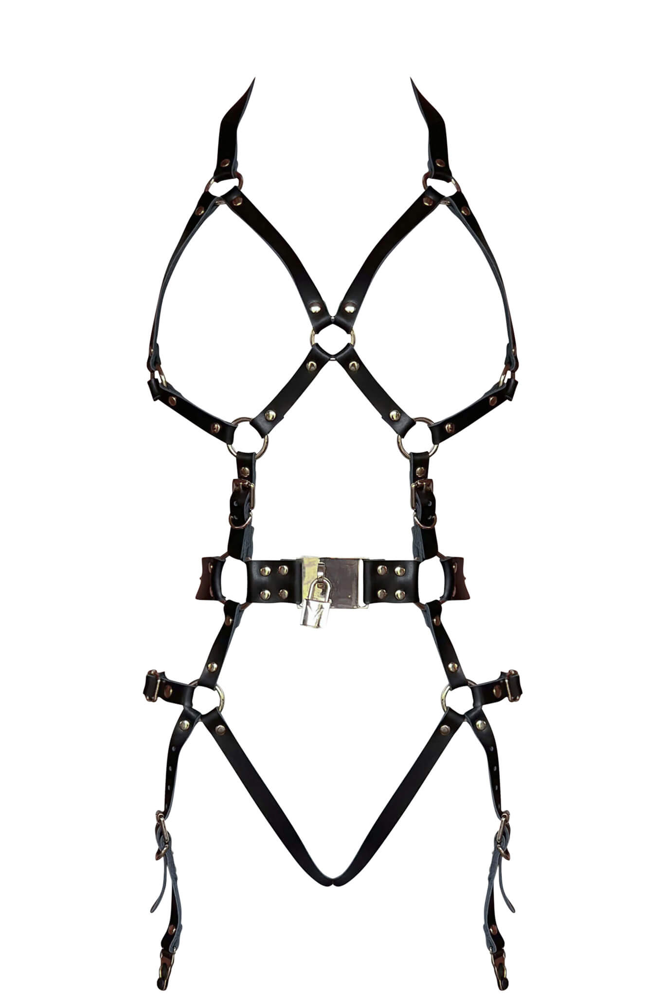 Crafted from sumptuous, soft leather, this exquisite piece features adjustable straps and nickel-free padlocks for a seamless blend of comfort and control. Elevate your evening with a design that contours to lift and define, complemented by a strategic O-ring for bondage elegance.