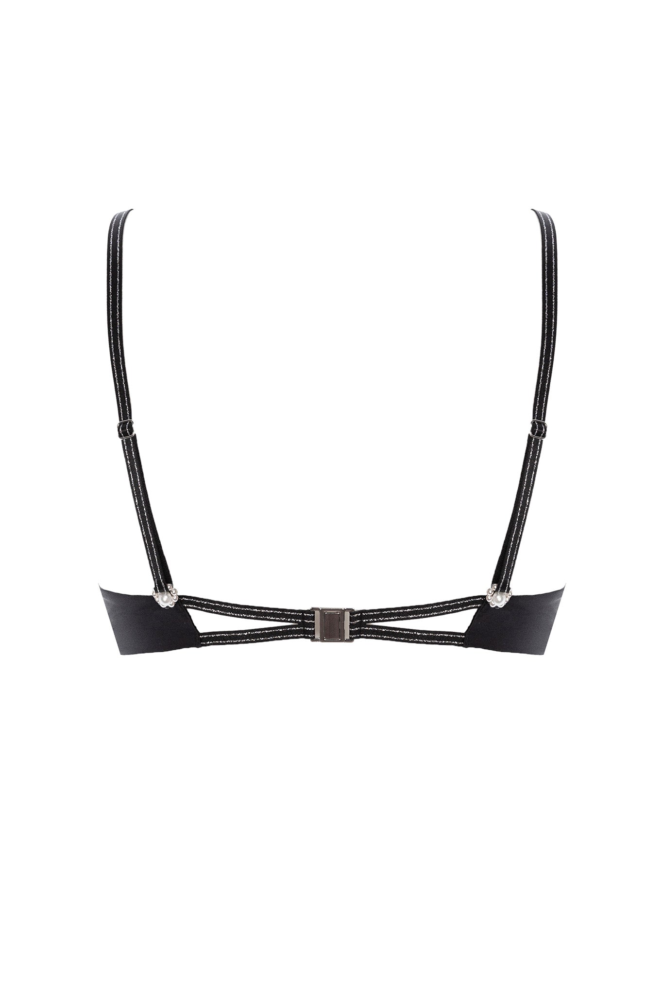 The best complement for your models from the Destinos line, whether thongs or jewelry (necklaces and bracelets). It is made with delicate Italian lace and elastic strips of silver lurex, soft French silk, silver appliqués and pearl details. Thanks to the pearl button closures, the straps can be interchanged and crossed in various ways. You can have two bras in one!