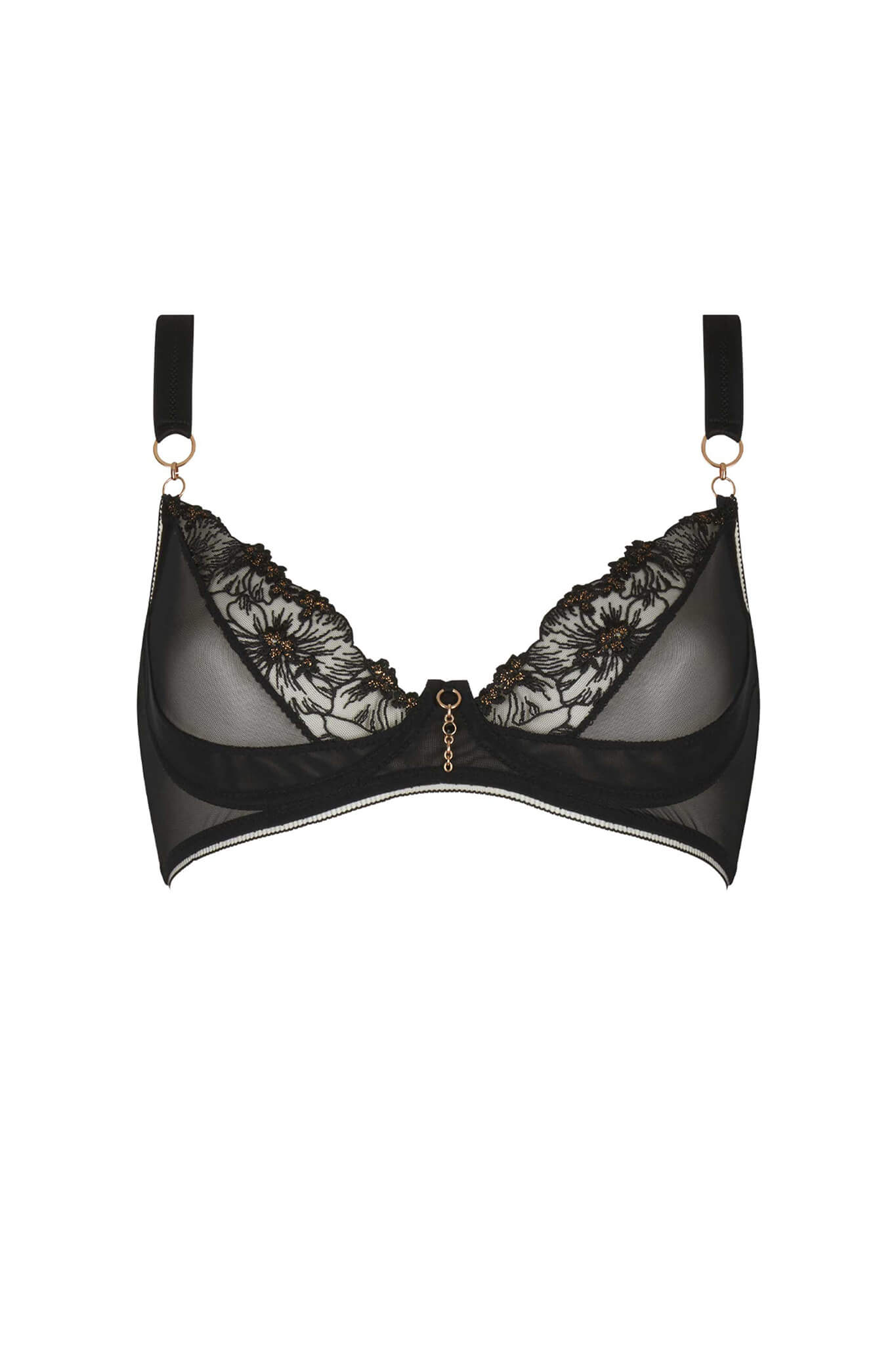 Bra in black stretch tulle embroidered with black and pink gold threads, mixed with stretch mesh. An enhancement for all breast shapes.